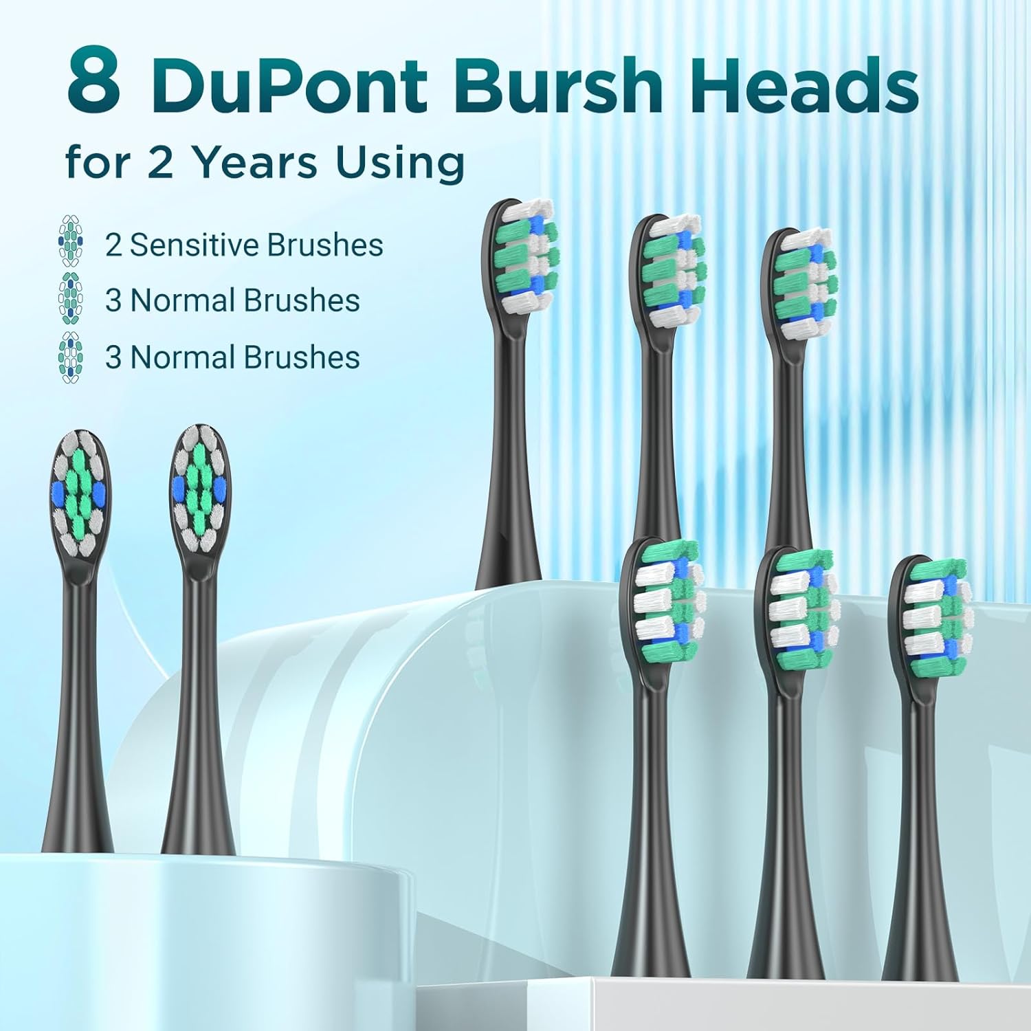 8 cabezales de cepillo de dientes para uso durante 24 meses: las cerdas tienen 3 colores, que son adecuados para distinguir a diferentes usuarios. Los cabezales de los cepillos pierden rigidez y se desgastan con el tiempo. Asegúrese de reemplazarlos cada 3 meses.