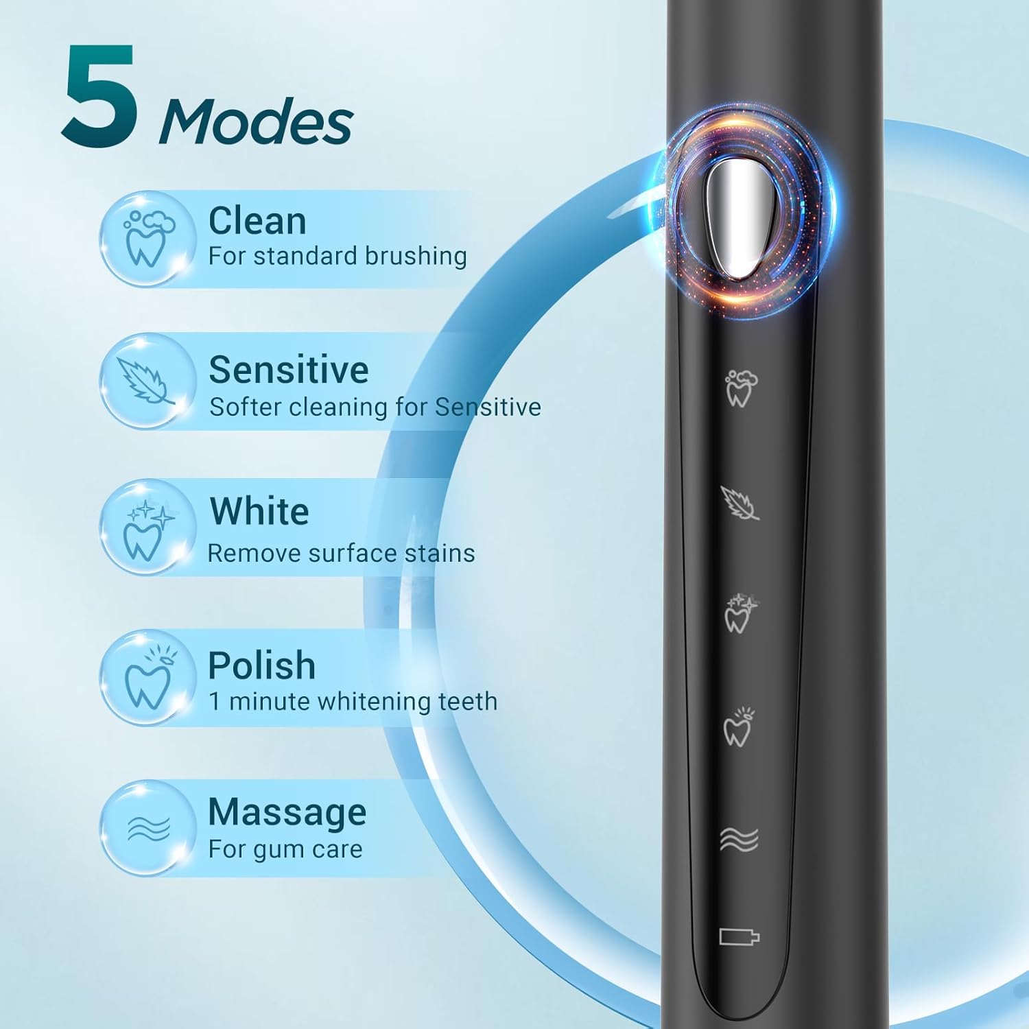 Cepillo de dientes eléctrico de 5 modos: sensible, limpiador, blanqueador, pulido y masaje; se adapta a sus necesidades de cuidado bucal. Presione brevemente para cambiar el modo y presione el botón de encendido durante 3 segundos para pausarlo.