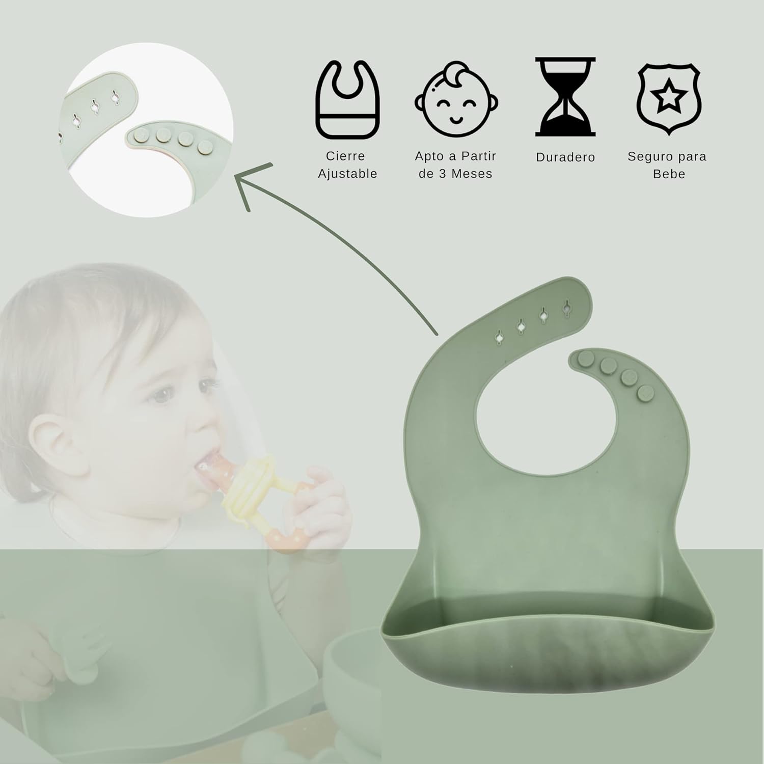 | – Babero de silicona ajustable para mayor comodidad | – Disponible en un solo color (verde) |