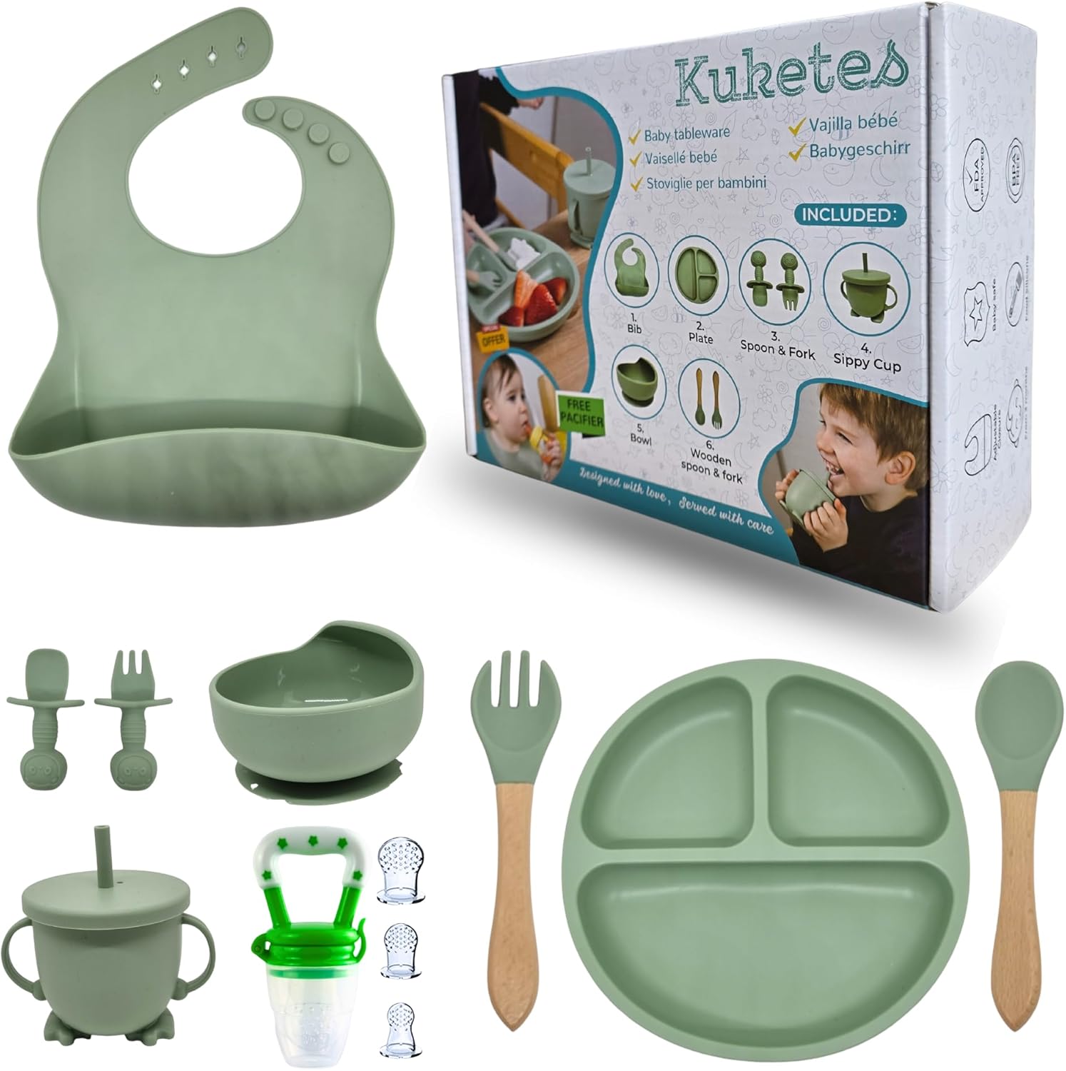 La vajilla para bebé de silicona de Kuketes es una excelente opción para aquellos padres que buscan un conjunto completo de utensilios seguros y funcionales para la alimentación de sus pequeños. Este set incluye un plato con ventosa para evitar derrames, un vaso antiahogo, cubiertos de madera y cubiertos de aprendizaje para bebés, así como un babero de silicona ajustable.