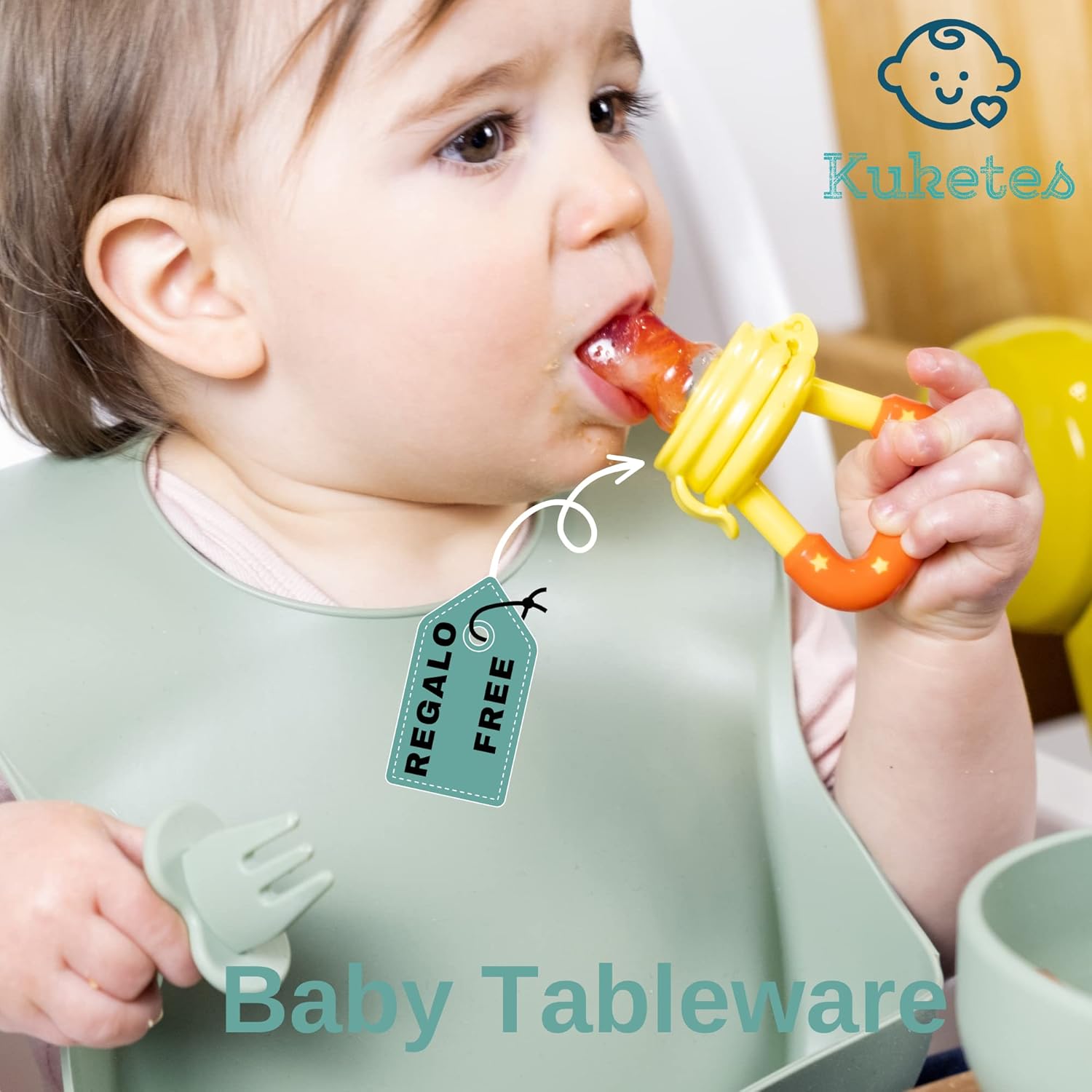 La vajilla para bebé Kuketes es la solución perfecta para facilitar la alimentación de tu bebé de manera segura y divertida. Consta de 9 piezas que incluyen un plato con ventosa, un vaso antiahogo, cubiertos de madera y cubiertos de aprendizaje para bebé, así como un babero de silicona. Además, como regalo adicional, se incluye un chupete de fruta para complementar la experiencia alimentaria de tu pequeño.