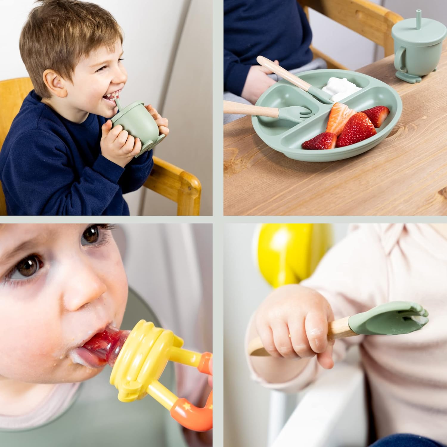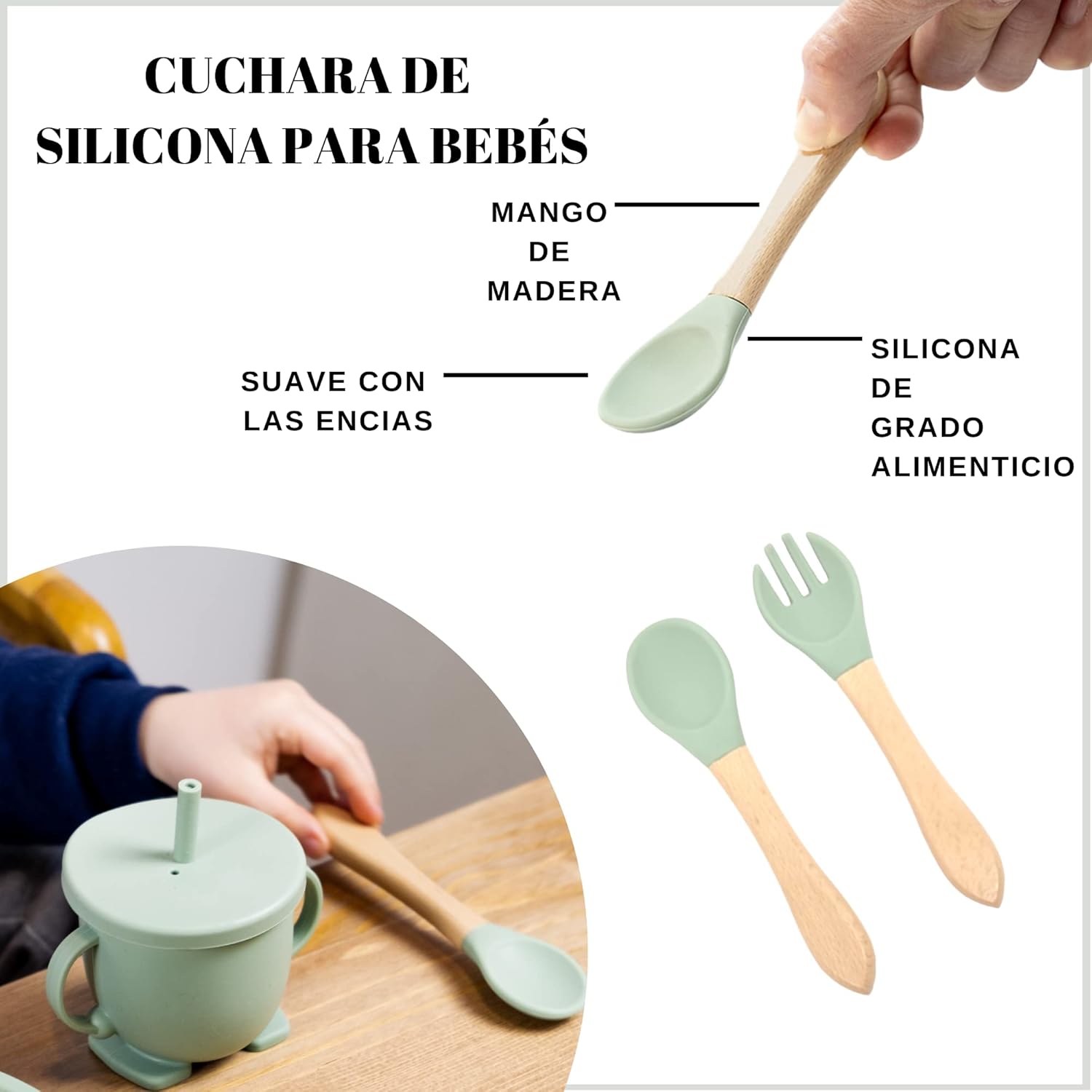 – Diseño ergonómico: los cubiertos de madera y de aprendizaje están diseñados para facilitar la alimentación del bebé.