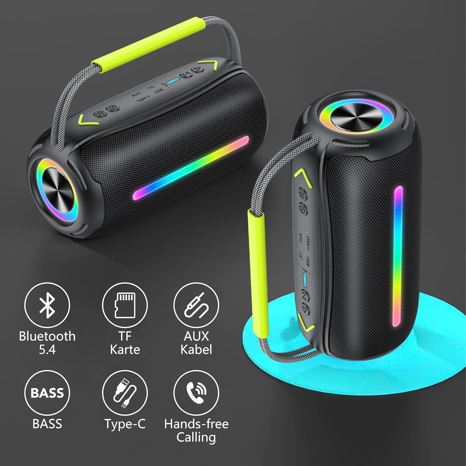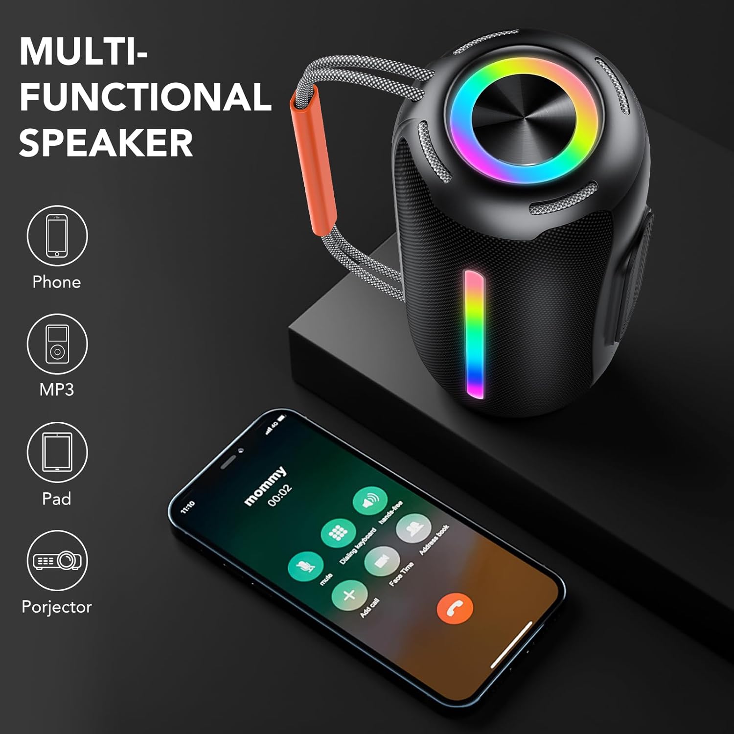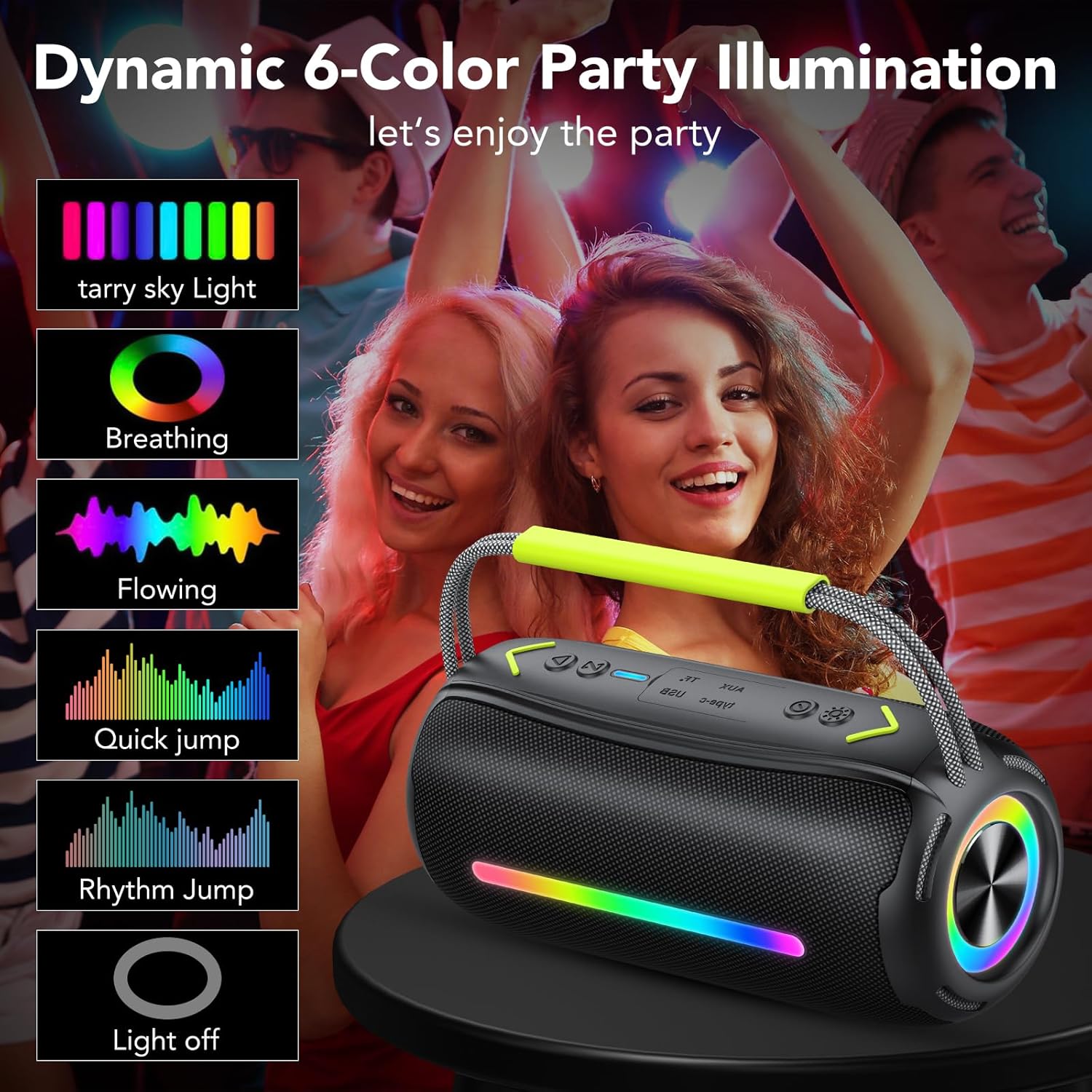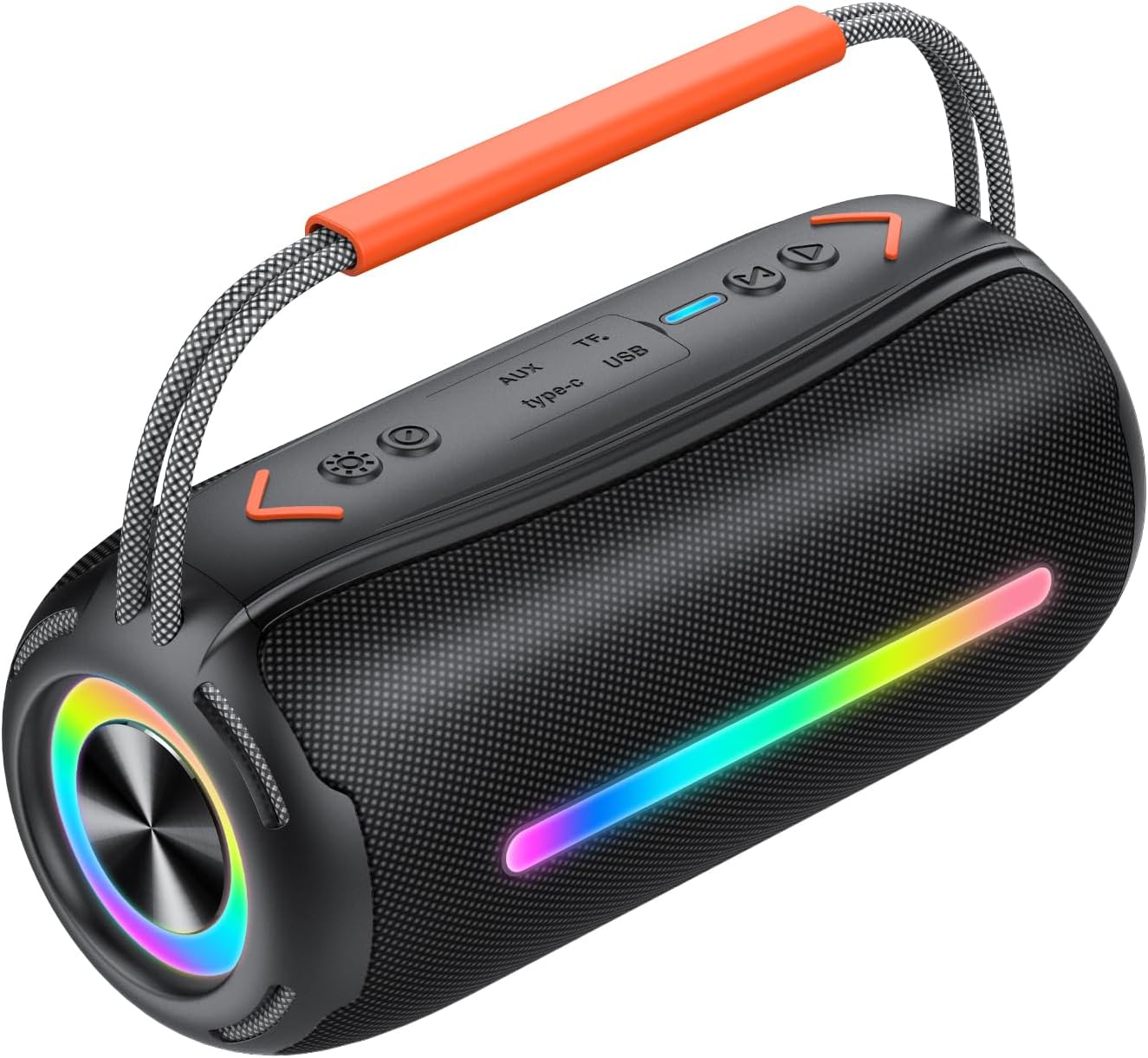 Luces RGB sincronizadas con el ritmo: Transforma tus fiestas con el espectáculo visual de luces RGB de 7 colores que pulsan al ritmo de la música. Crea un ambiente inolvidable con efectos dinámicos o apaga las luces según tus preferencias. ¡El altavoz bluetooth ideal para cualquier ocasión!
