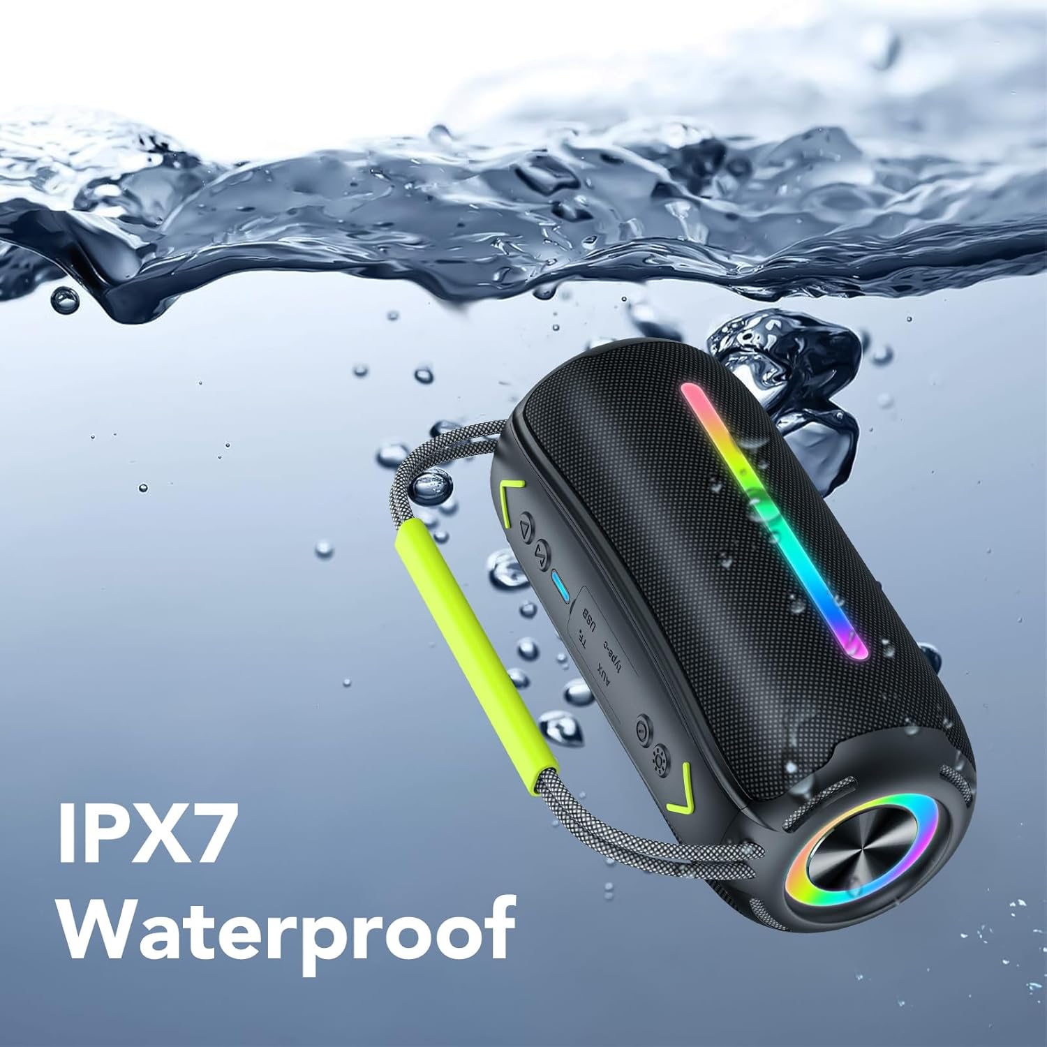 Diseño portátil y resistente **IPX7**: Con mango removible y un diseño compacto, este altavoz portatil es perfecto para llevarlo a cualquier lugar. Gracias a su certificación IPX7, resiste lluvias y splashes, mientras su construcción de alta calidad garantiza durabilidad en todo tipo de condiciones.