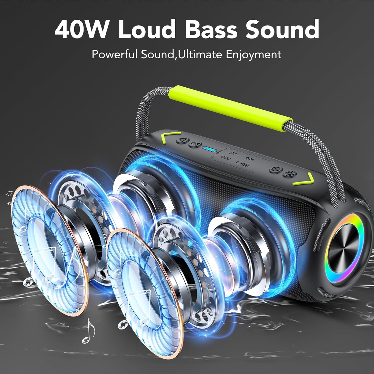 Para consultar el precio del Altavoz Bluetooth Portátil 40W con Asa, simplemente haz clic en el botón que se encuentra a continuación. Este altavoz potente cuenta con subwoofer doble, controladores de graves duales, es impermeable con certificación IPX7, tiene luz RGB, y cuenta con funciones TWS/AUX/TF. ¡No te pierdas la oportunidad de adquirir este producto ideal para disfrutar de tu música favorita en cualquier lugar!
