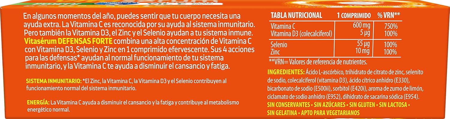 En algunos momentos del año, puedes sentir que tu cuerpo necesita una ayuda extra. La Vitamina C es reconocida por su ayuda al sistema inmunitario. Pero también la Vitamina D3, el Zinc y el Selenio ayudan a tu sistema inmune. Vitasérum DEFENSAS FORTE combina una alta concentración de Vitamina C con Vitamina D3, Selenio y Zinc en 1 comprimido efervescente. Sus 4 acciones para las defensas ayudan al normal funcionamiento de tu sistema inmunitario, y la Vitamina C te ayuda a disminuir el cansancio y fatiga.