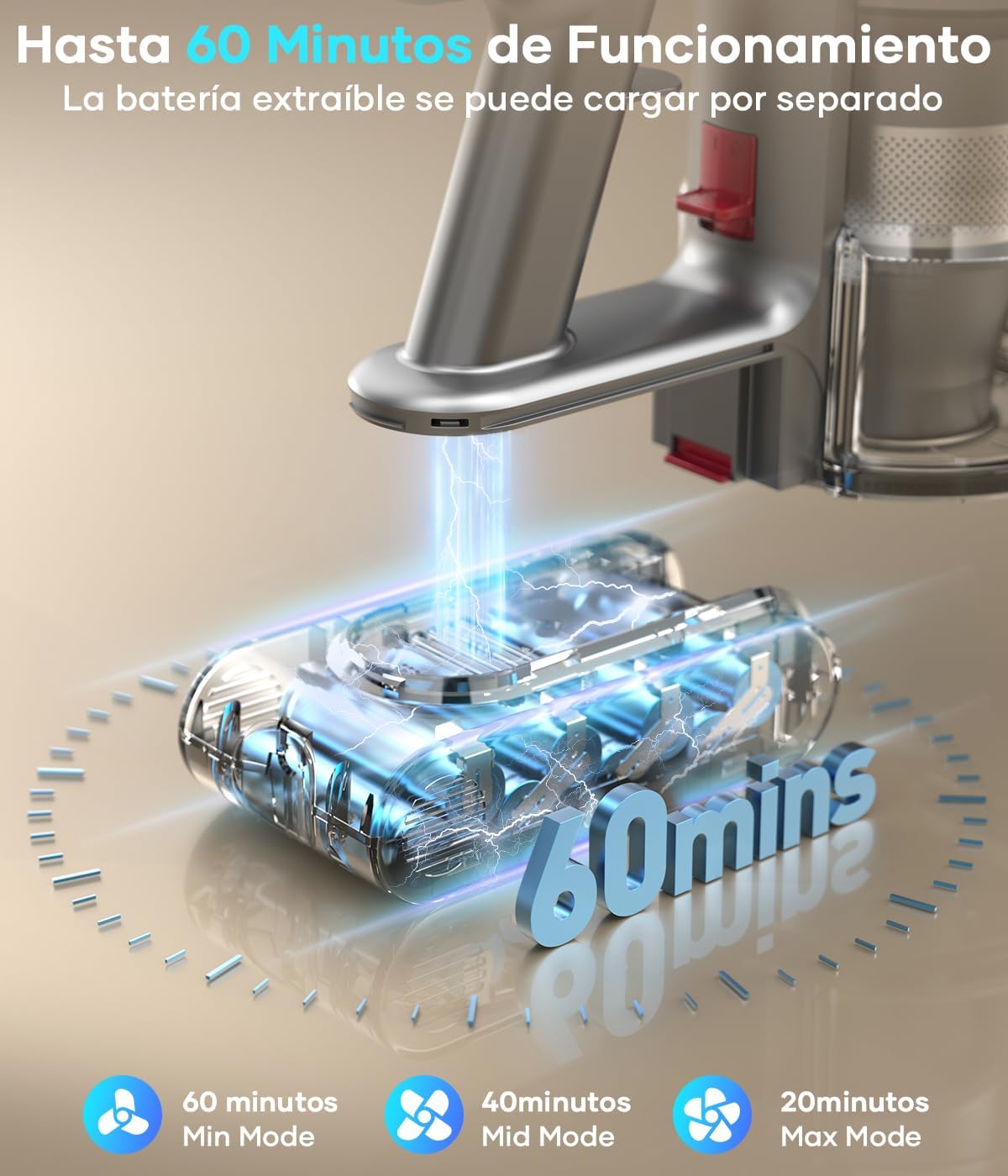 Los clientes dicen: Los clientes están satisfechos con la potencia de succión, que aspira perfectamente. Además, destacan su calidad y precio competitivo. La batería dura más de una hora, lo que permite limpiar toda la casa sin necesidad de gastar un dineral. Además, consideran que es fácil de manejar y ensamblar.