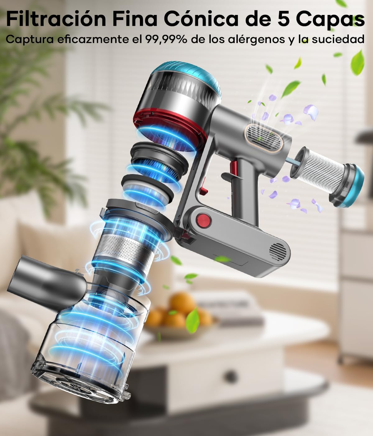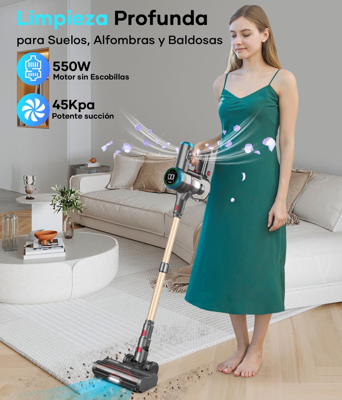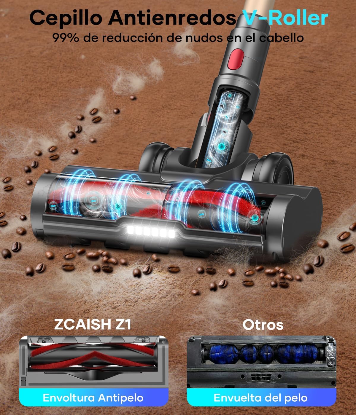 Aspiradora sin cable ZCAISH Z1: La aspiradora inalámbrica ZCAISH Z1 está equipada con un nuevo motor sin escobillas mejorado de 550 W, que le da a la aspiradora una fuerte potencia de succión de 45 Kpa. Con una batería de larga duración de hasta 60 minutos, pantalla LED para ajustar modos de succión, sistema de aroma y filtro HEPA de 5 etapas, esta aspiradora es ideal para suelos, alfombras y pelo de animales.