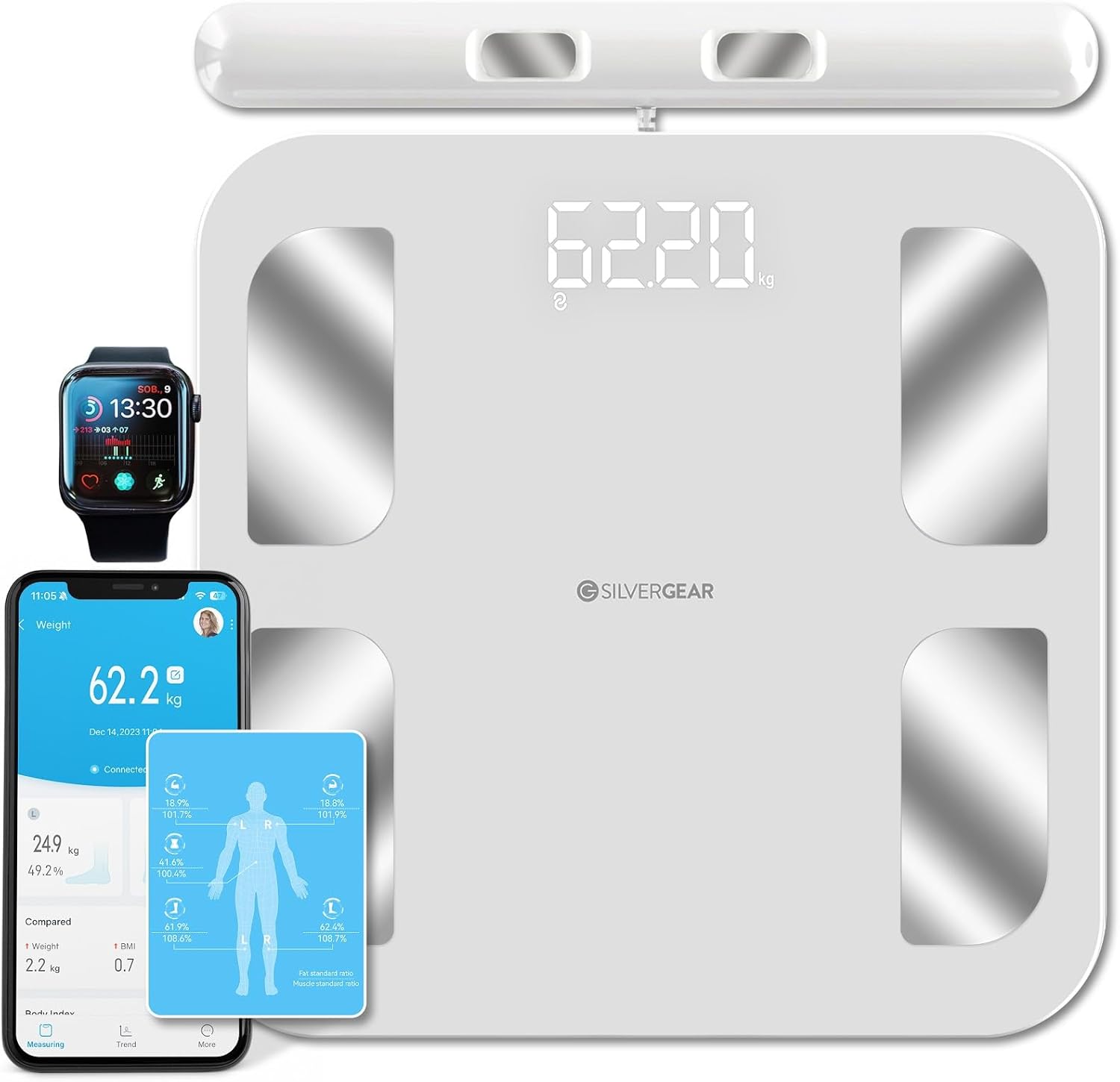 Silvergear® Báscula de Baño Intelligente con Mango | Bascula Grasa Corporal y Muscular | 8 Sensores | Masa Muscular, IMC, Peso Óseo, BMR, Frecuencia Cardíaca | con App | Blanco – ¿vale la pena?