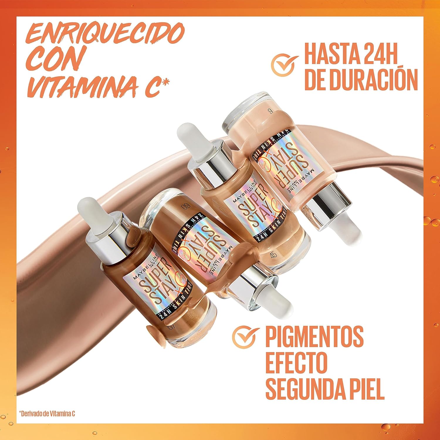 Base de maquillaje Superstay Skin Tint enriquecida con Vitamina C* (*derivado de la Vitamina C) para un acabado natural y larga duración hasta 24H