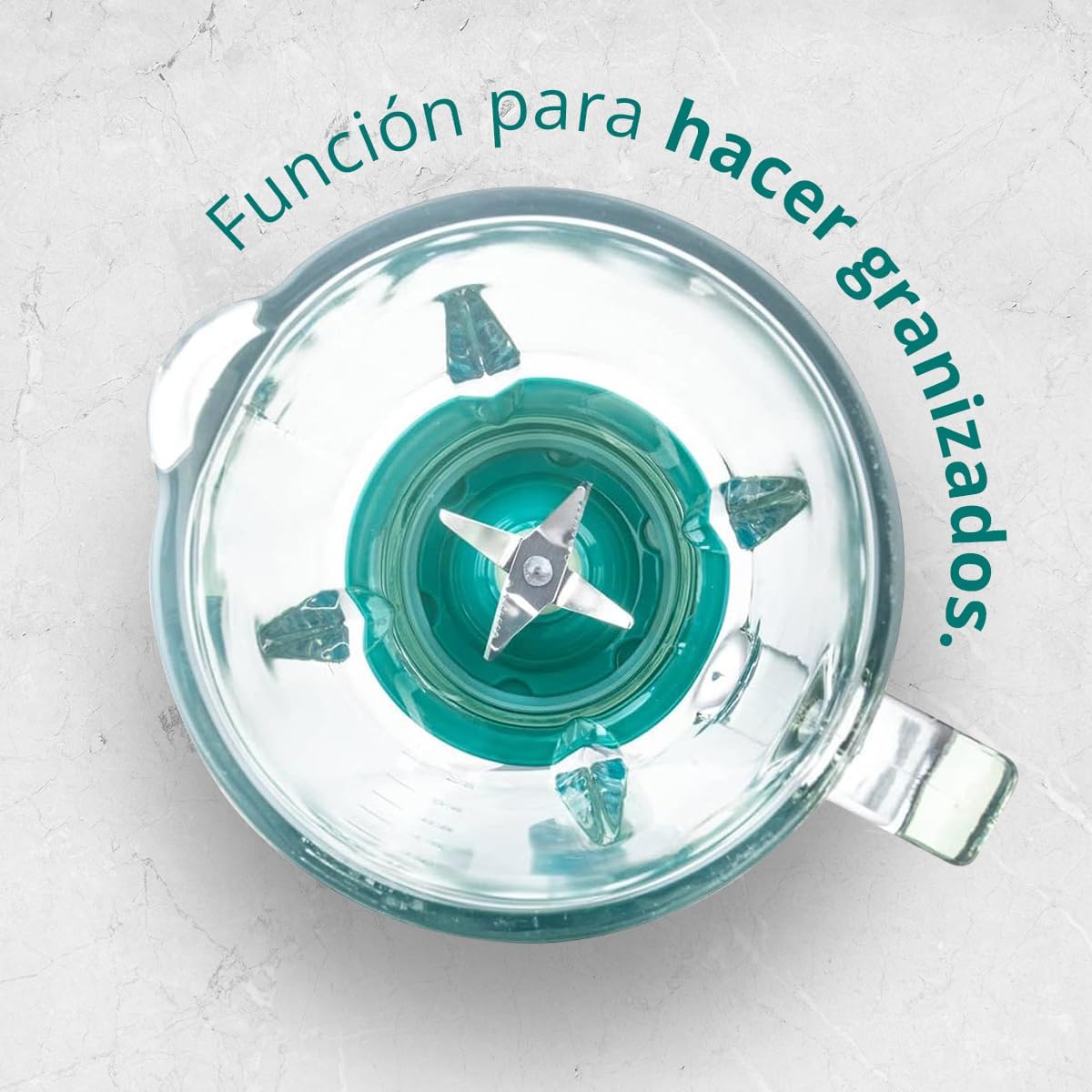 La capacidad de la jarra de cristal es de 1.5 litros, lo que te permitirá preparar desde batidos suaves hasta salsas espesas. Incluso cuenta con una función especial para hacer granizados, ideal para los días calurosos. La jarra es extraíble para facilitar la limpieza y su diseño compacto no ocupará mucho espacio en tu cocina.