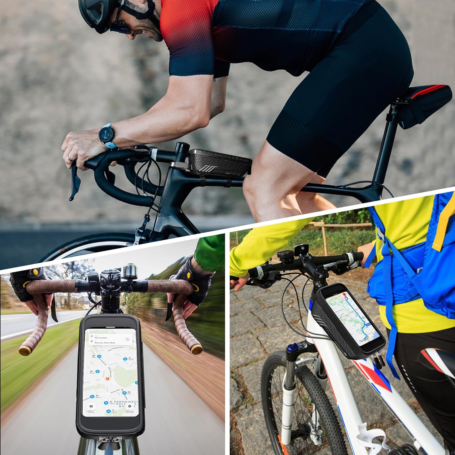 Diseño Sofisticado: Esta bolsa para cuadro de teléfono de bicicleta está especialmente diseñada para entusiastas del ciclismo para garantizar la estabilidad y seguridad del teléfono durante la conducción. Esto permite a los ciclistas utilizar y comprobar sus teléfonos móviles de forma fácil y segura mientras conducen. Las bolsa de soporte son uno de los ciclismo accesorios esenciales para bicicleta montaña es adecuada para teléfonos móviles de menos de 6,7 pulgadas.