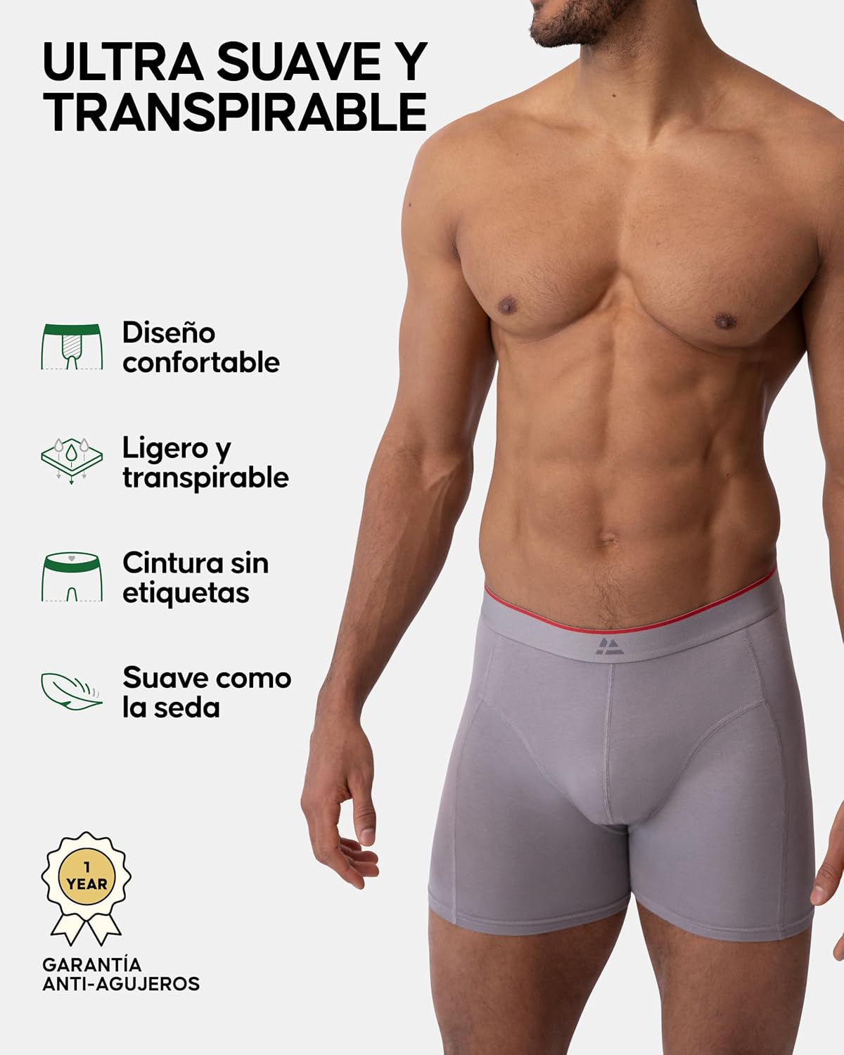Estos boxers son un poco más largos que los boxers normales, lo que los hace ideales para el uso diario. Diseñados en Dinamarca, están hechos de una mezcla de viscosa de bambú, algodón y elastano, certificados con el estándar OEKO-TEX 100. Además, vienen en envases de papel reciclado para evitar residuos plásticos.