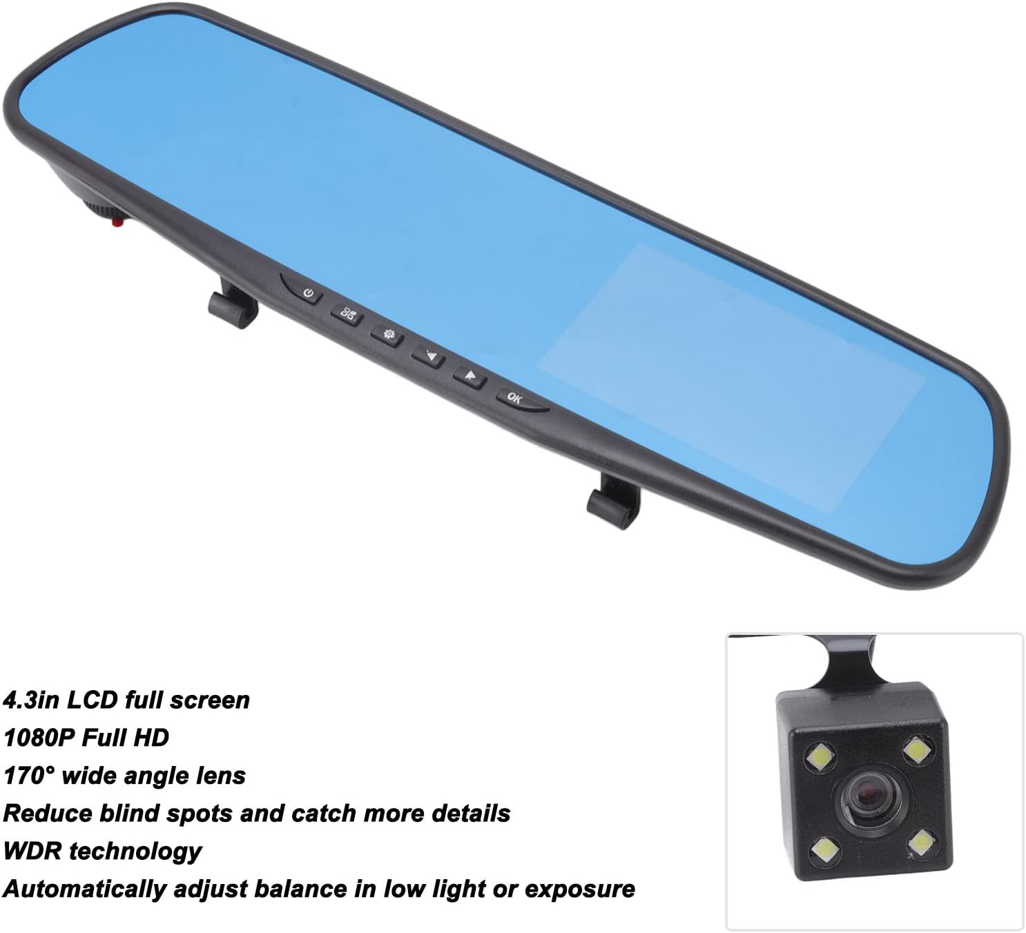 Tecnología WDR: La parte delantera de la grabadora de video del espejo retrovisor también está equipada con una tecnología especial de amplio rango dinámico (WDR) que ajusta automáticamente el balance en condiciones de poca luz o exposición.