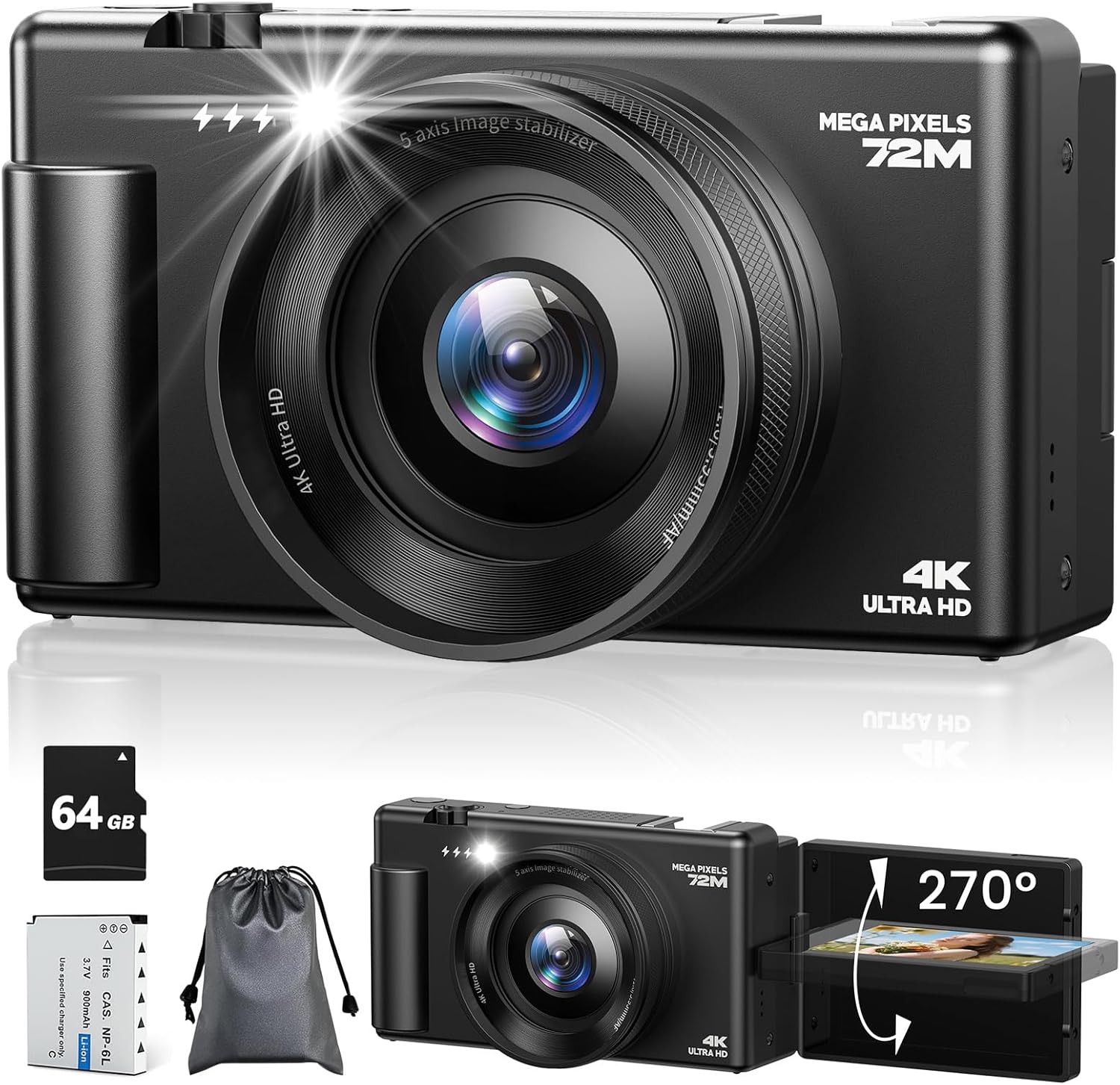 Cámara Digital 4K, Vlog Cámara de Fotos Antivibración con Enfoque Automático de 72MP 18X Zoom, Pantalla Flip de 270° Camara Digital Compacta con Batería Tarjeta de 64GB para Fotografica Vlog Negro – ¿Vale la pena?