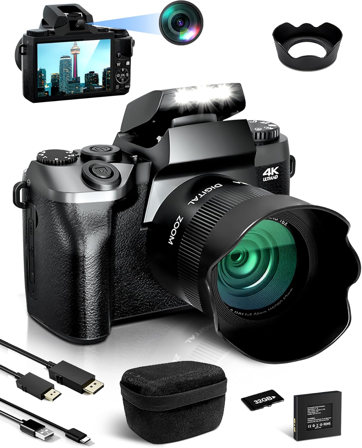 CREATIVIDAD EN EL ESPEJO: DE VLOGGER A FOTOGRAFO DE ARTE Libera tu potencial creativo con funciones profesionales: lapso de tiempo para fenómenos naturales, tomas continuas para escenas de acción, grabación en bucle para proyectos artísticos o pausa en video para un vlog perfecto. Con el zoom digital de 16x no se pierde ningún detalle. El kit completo incluye una tarjeta TF de 64 GB, batería de 3000 mAh y una práctica bolsa de cámara: todo lo que necesitas para tomar fotos perfectas. ¡Empieza a comprar!