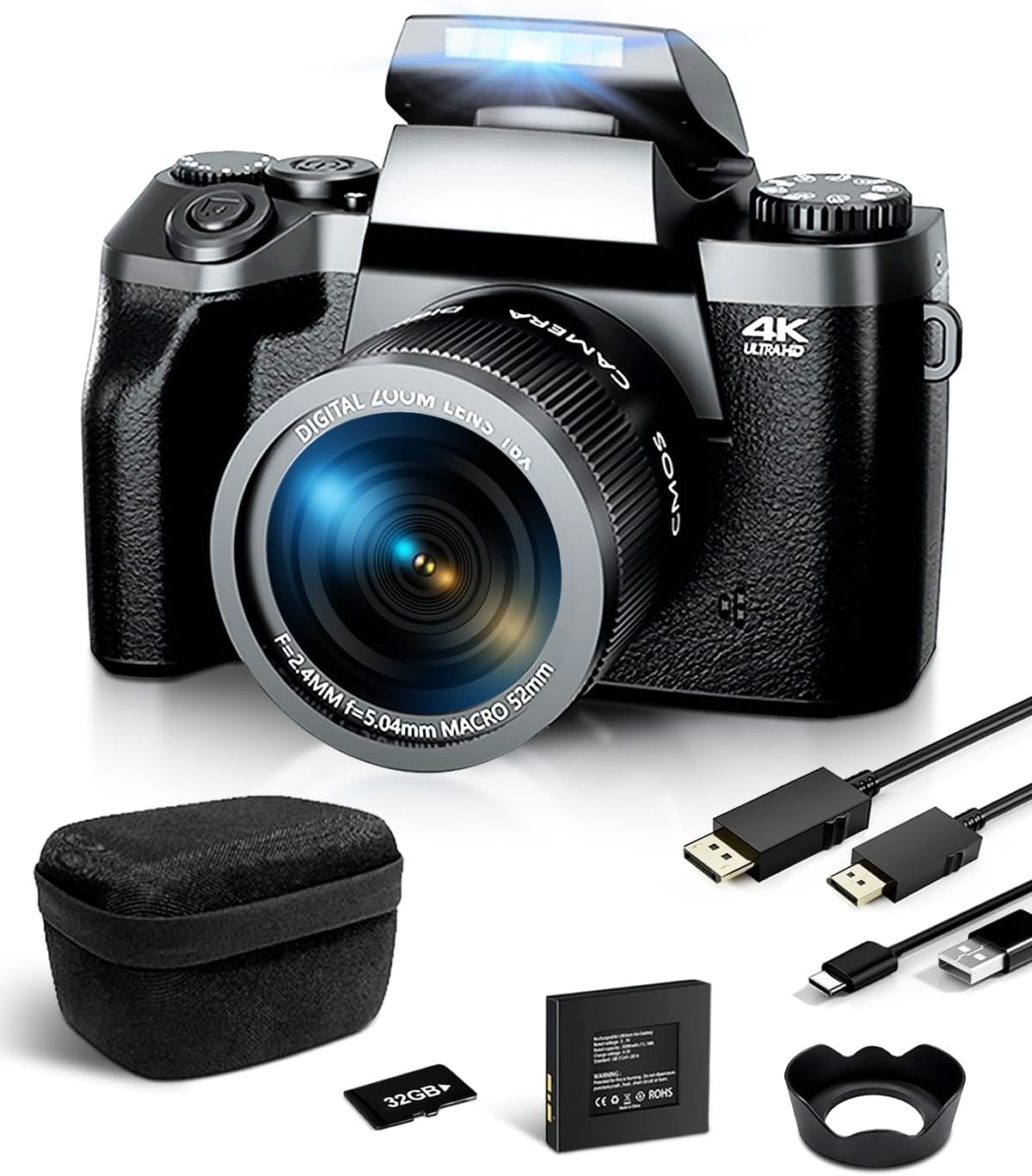 Además, la cámara viene con accesorios como una tarjeta TF de 32GB, cable USB, cable HDMI, batería de iones de litio recargable, manual, bolso de la cámara y parasol.