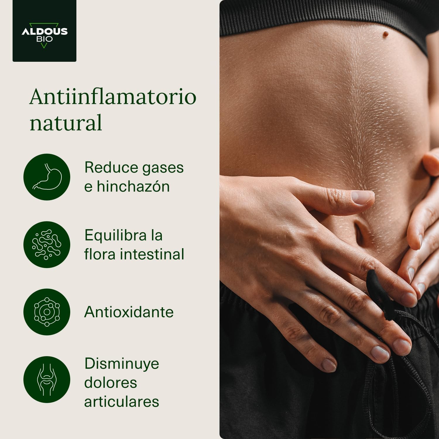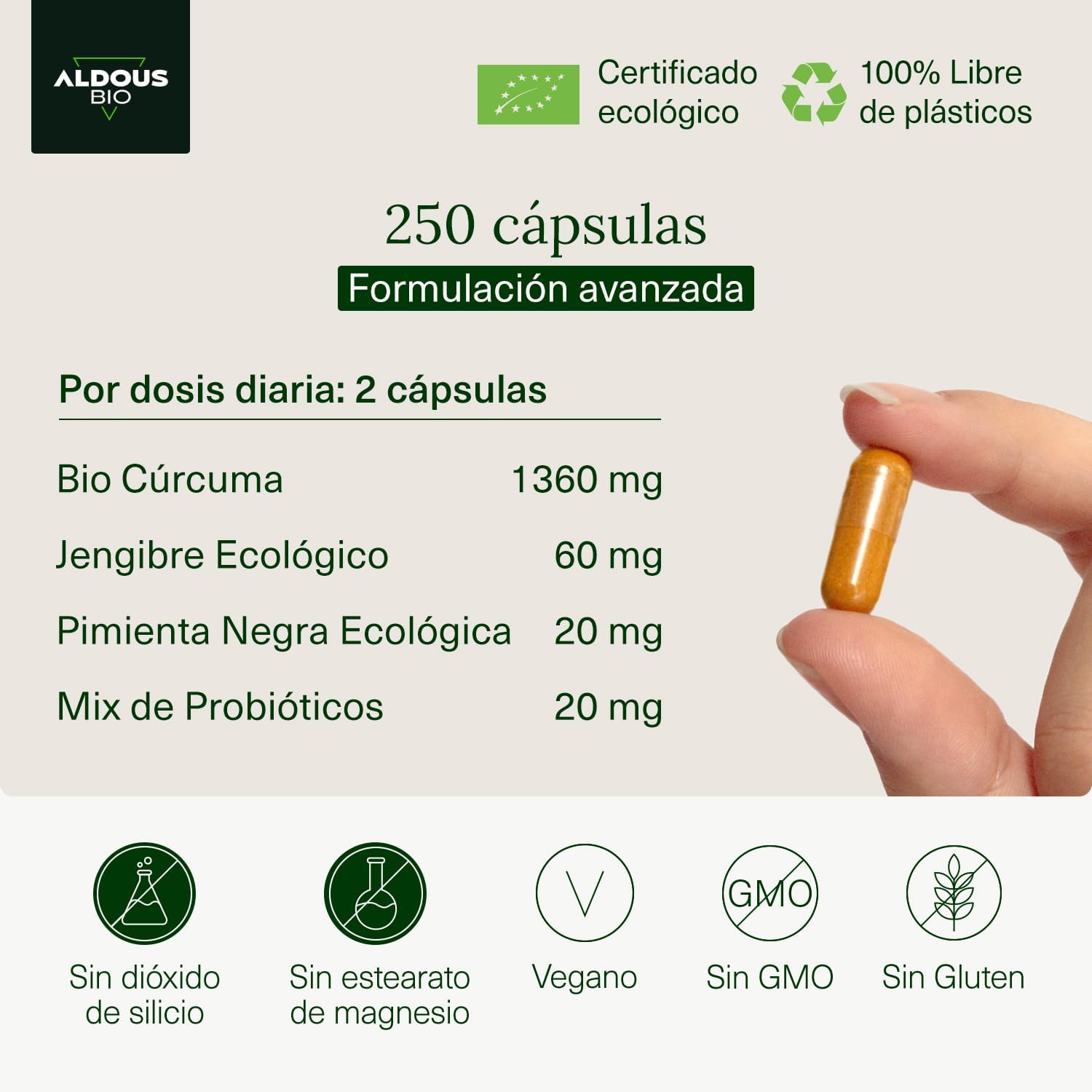 🌎 ÚNICA CÚRCUMA ECOLÓGICA ENRIQUECIDA CON PROBIÓTICOS SIN ADITIVOS – La cúrcuma Aldous Bio contiene 1460mg por dosis diaria. Nuestra avanzada formulación añade un mix de probióticos al extracto de curcuma pura en polvo con jengibre y pimienta negra que potencia la efectividad para detoxificar y estimular el metabolismo, e incrementa el poder antiinflamatorio y antioxidante de formulaciones básicas de curcuma en capsulas sin probiótico, con mejores resultados para problemas digestivos o dolores articulares.