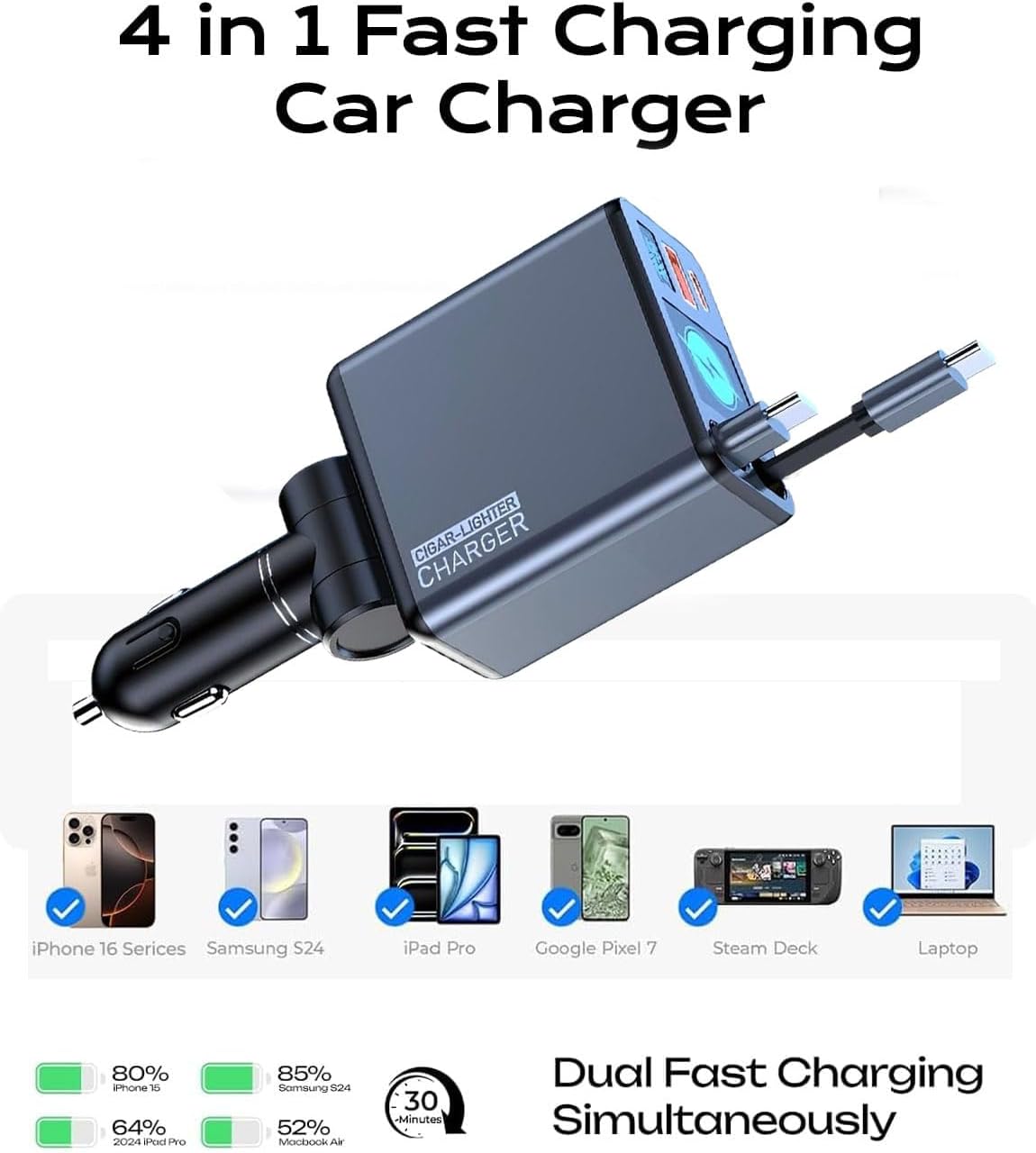 El cargador de coche retráctil 4 en 1 YuSailng ofrece un diseño compacto y potente. Soporta 160 ° de rotación con un cable retráctil que se extiende hasta 35,43 pulgadas, ideal para viajes largos y espacios reducidos. Este cargador es perfecto como regalo o para uso personal, y combina comodidad y funcionalidad para todas sus necesidades de carga en el coche.