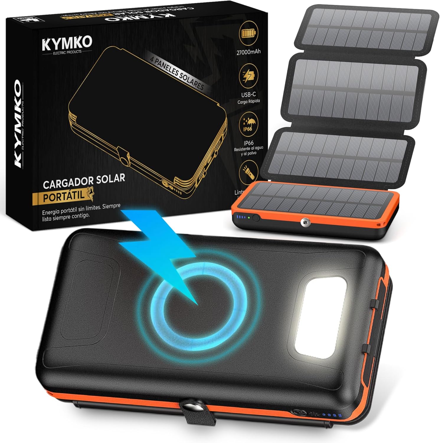 KYMKO® Cargador Solar para móvil 27000mAh con 4 Paneles solares Plegables | Power Bank Solar portátil USB-C 22.5W, Linterna LED SOS, batería Externa IP66 | Ideal para apagones y emergencias – ¿vale la pena?