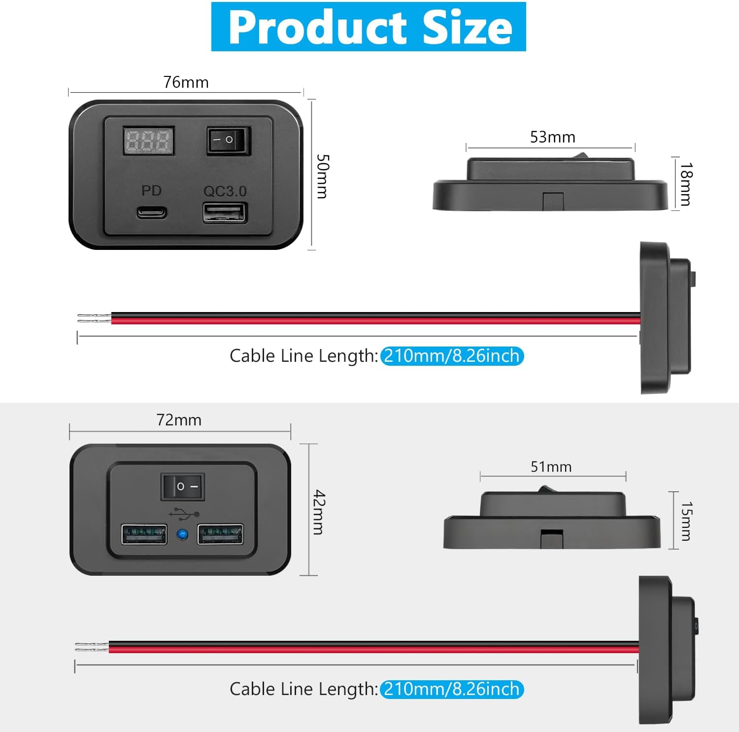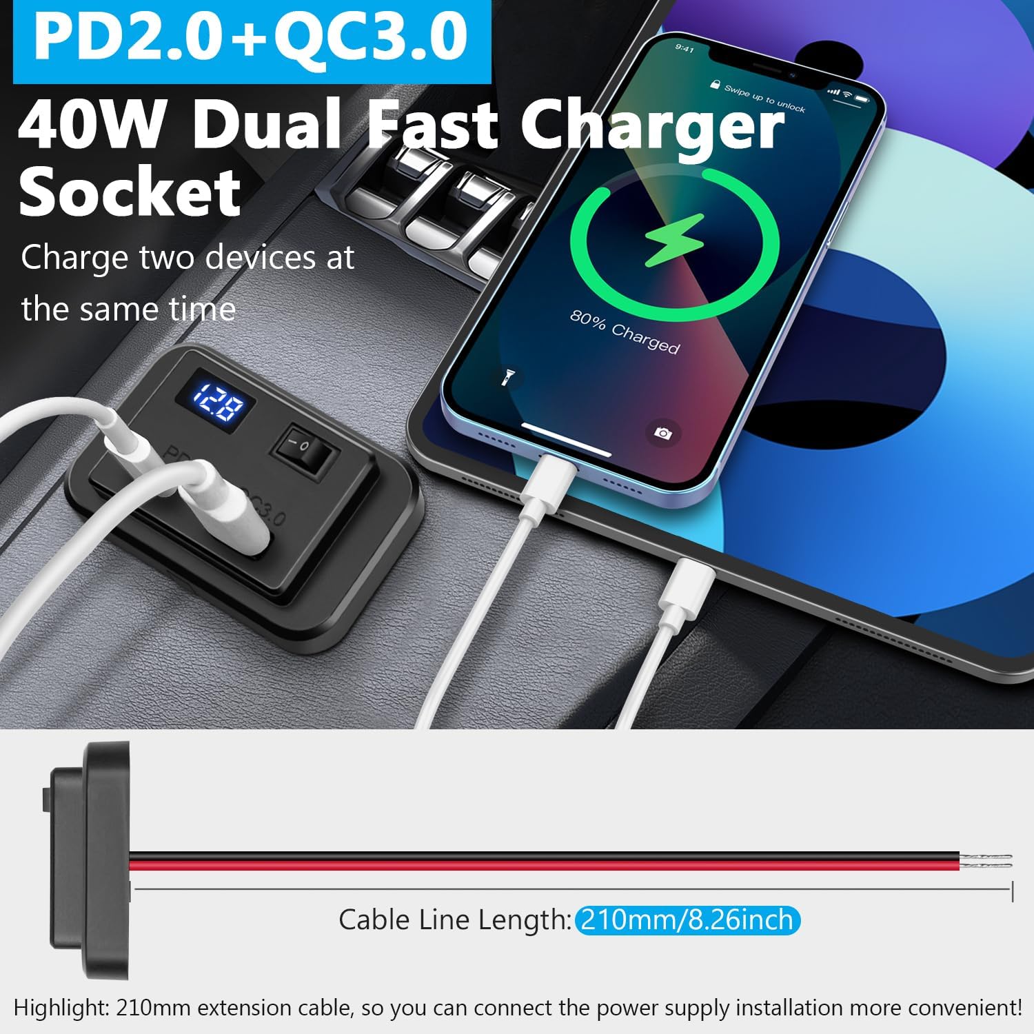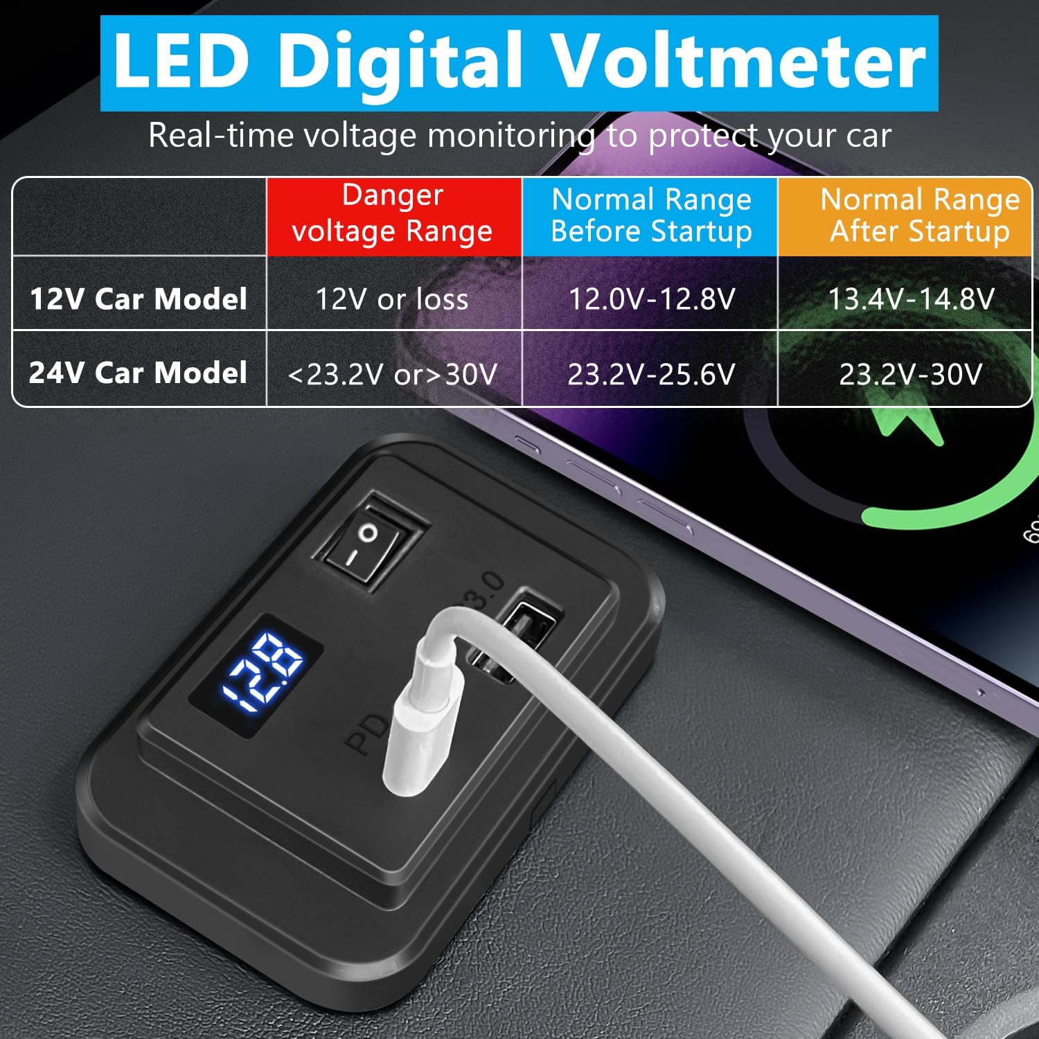 El Hoembpn Toma USB C Coche es un cargador de alta calidad con dos puertos de carga rápida PD2.0 + QC3.0 que te permitirá cargar dos dispositivos de forma eficiente. Además, cuenta con un voltímetro LED integrado para monitorizar el voltaje de tu batería en tiempo real y un interruptor de encendido/apagado para controlar los puertos y ahorrar energía.