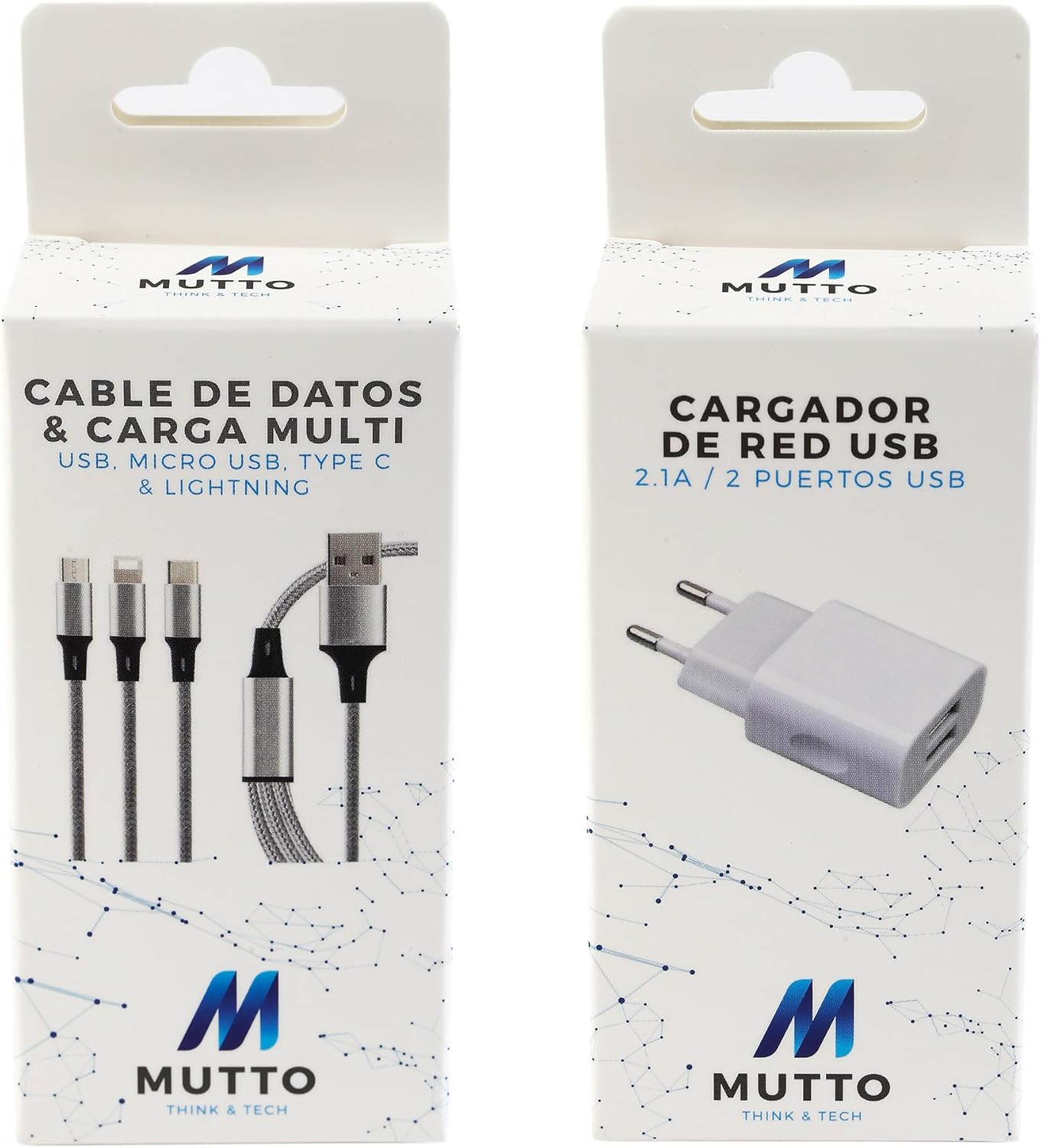 MUTTO: Tecnología esencial al alcance de todos. Enchufe de Pared doble USB + Cable Multi Conector 3 en 1 USB a USB C/LIGHTNING/MICRO USB. Paga lo justo por un producto útil y de calidad. Ideal para cargar cualquier tipo de dispositivo y móvil a la vez. Carga tu smartphone, Ipad, Tablet, MP3, Powerbank, Lámpara, Altavoz, Cámara y mucho más. Cargador con dos puertos USB 5V2A/10W, uno de 2.1 para carga rápida y otro 1.0 de carga normal. El cable multiconector es de 1,2 metros de USB a USB C/LIGHTNING/MICRO USB.