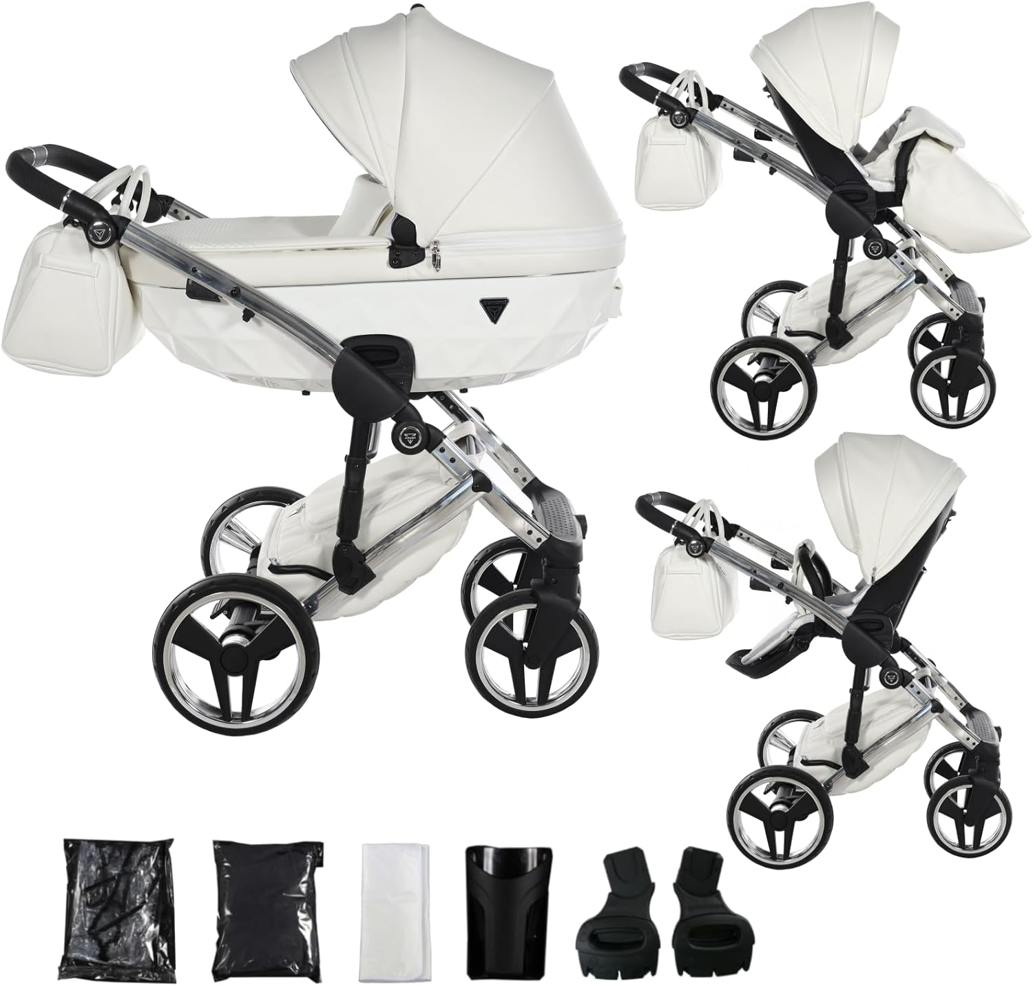 El set incluye numerosos accesorios como una funda para la lluvia, una mosquitera, un bolso cambiador, un mini cambiador, un portavasos y una cesta sujeta al chasis del cochecito. Además, se puede complementar con adaptadores para sillas de coche de marcas específicas.