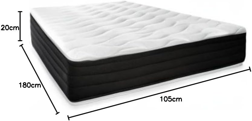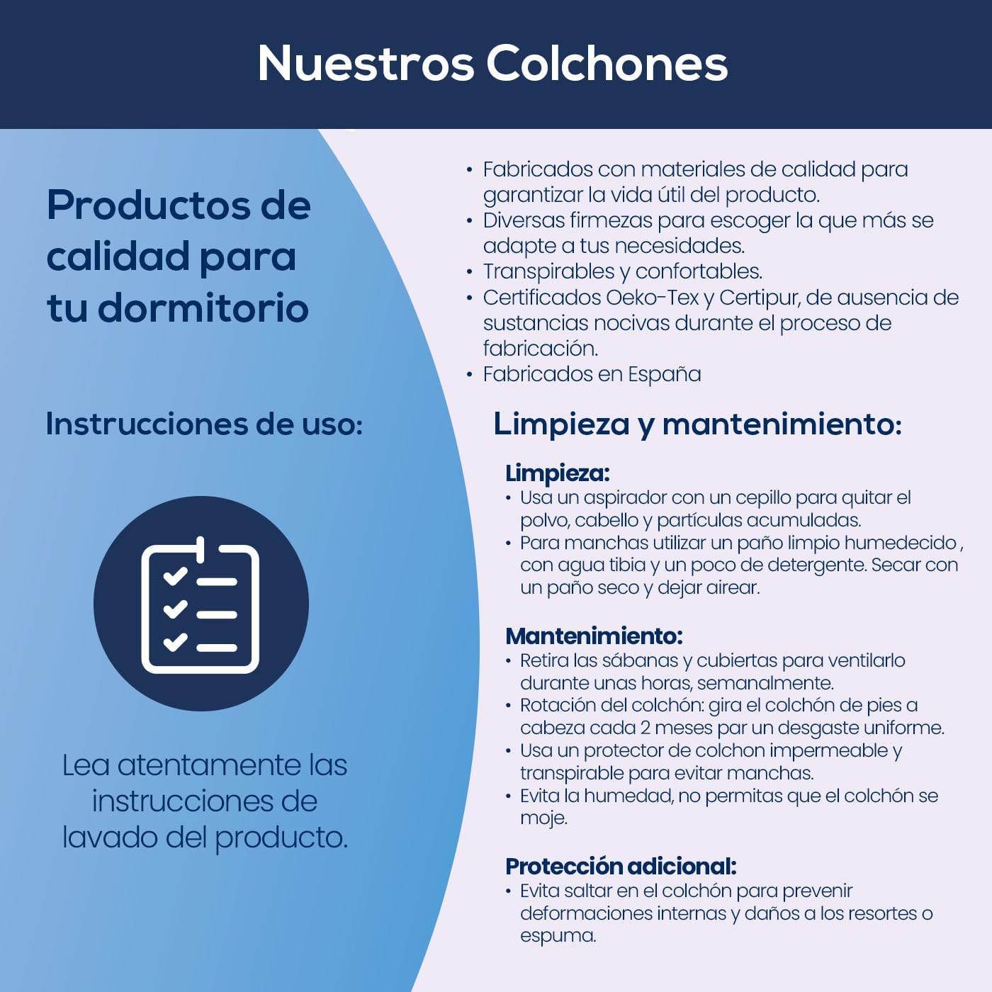 No utilizar objetos punzantes para su desembalado. Una vez abierto, dejar reposar 24 horas para que recupere su forma completamente. Altura total de 20 cm: Disfruta de un colchón versátil con dos caras para adaptarse a cada estación: una cara para invierno y otra para verano. Ofrece una firmeza media-alta ideal para quienes buscan un equilibrio perfecto entre soporte y comodidad. Núcleo de espuma HR de alta densidad que proporciona un apoyo perfecto para la columna, asegurando un descanso saludable y cómodo. Cara invierno con tejido stretch blanco de alto gramaje con 2 cm de viscoelástica de alta calidad (65 kg/m3) y fibras hipoalergénicas para una calidez y confort excepcionales. Cara verano con tejido malla 3D súper transpirable y fibras hipoalergénicas para una frescura y ventilación óptimas. Colchón reversible para utilizar por ambas caras (invierno-verano) y fabricado en España con certificados Oeko-Tex y Certipur. Lateral del colchón en color negro fabricado con tejido 3D para una mejor ventilación, tratado contra ácaros, bacterias y hongos, y con tratamiento hipoalergénico para mayor protección.