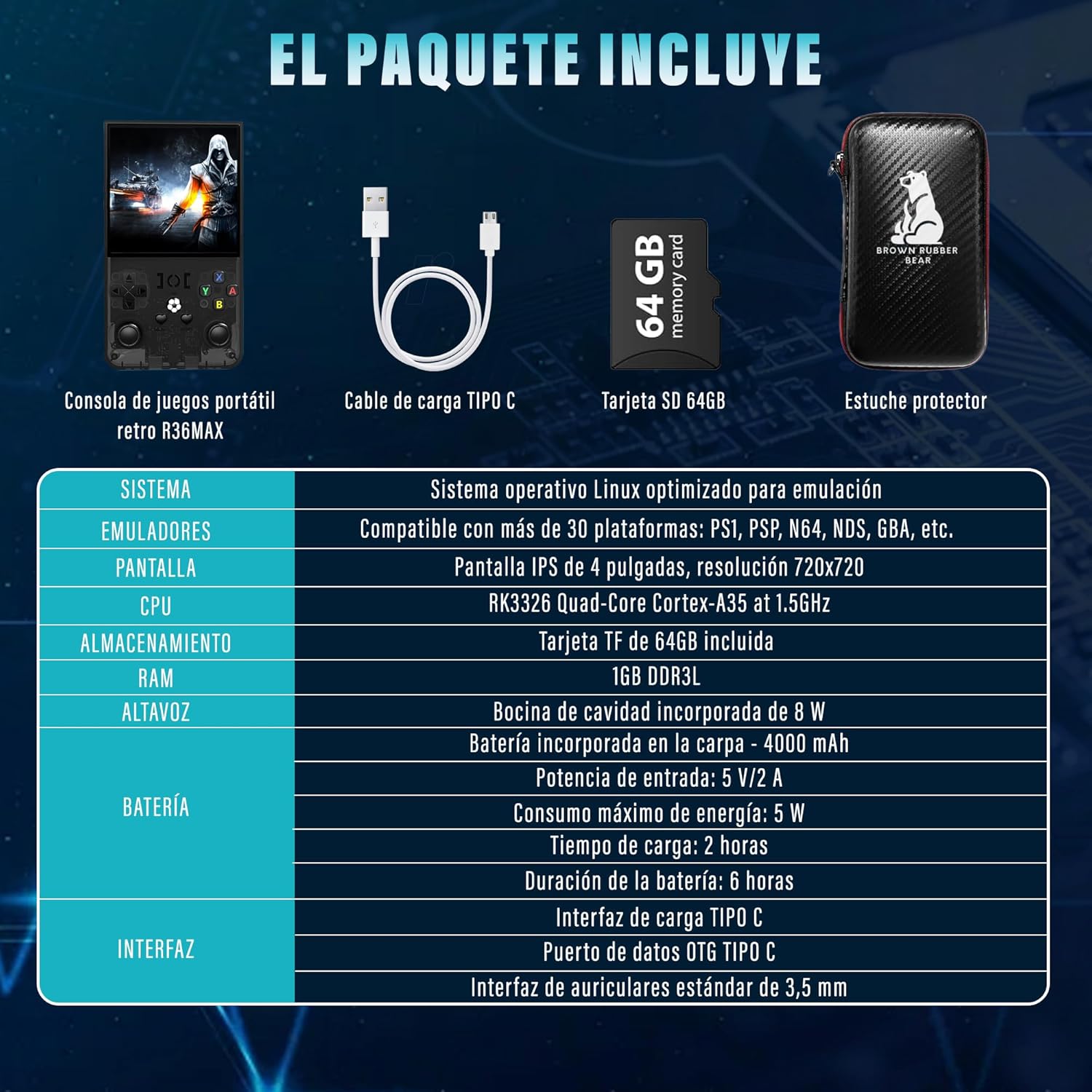 Hubo una época en la que los juegos no necesitaban gráficos en 4K para emocionarte. Bastaban un par de botones, una historia pixelada y el desafío de superar niveles imposibles. La R36MAX no es solo una consola portátil: es una máquina del tiempo. Te conecta con aquellas tardes interminables frente al televisor, con el sonido del “start” que marcaba el comienzo de la aventura. Y si no viviste esa época, esta es tu oportunidad de descubrir por qué marcó a toda una generación. Llévala contigo, juega cuando quieras y revive lo mejor del retro gaming… como nunca antes.