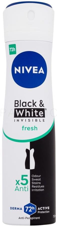 Apto para todo tipo de piel, el antitranspirante NIVEA Black & White Invisible Active Spray cuida y protege tus axilas durante 48 horas y, gracias a su formato en spray, deja una agradable sensación refrescante. Además, se seca rápidamente y deja en la piel un aroma duradero, fresco y femenino.