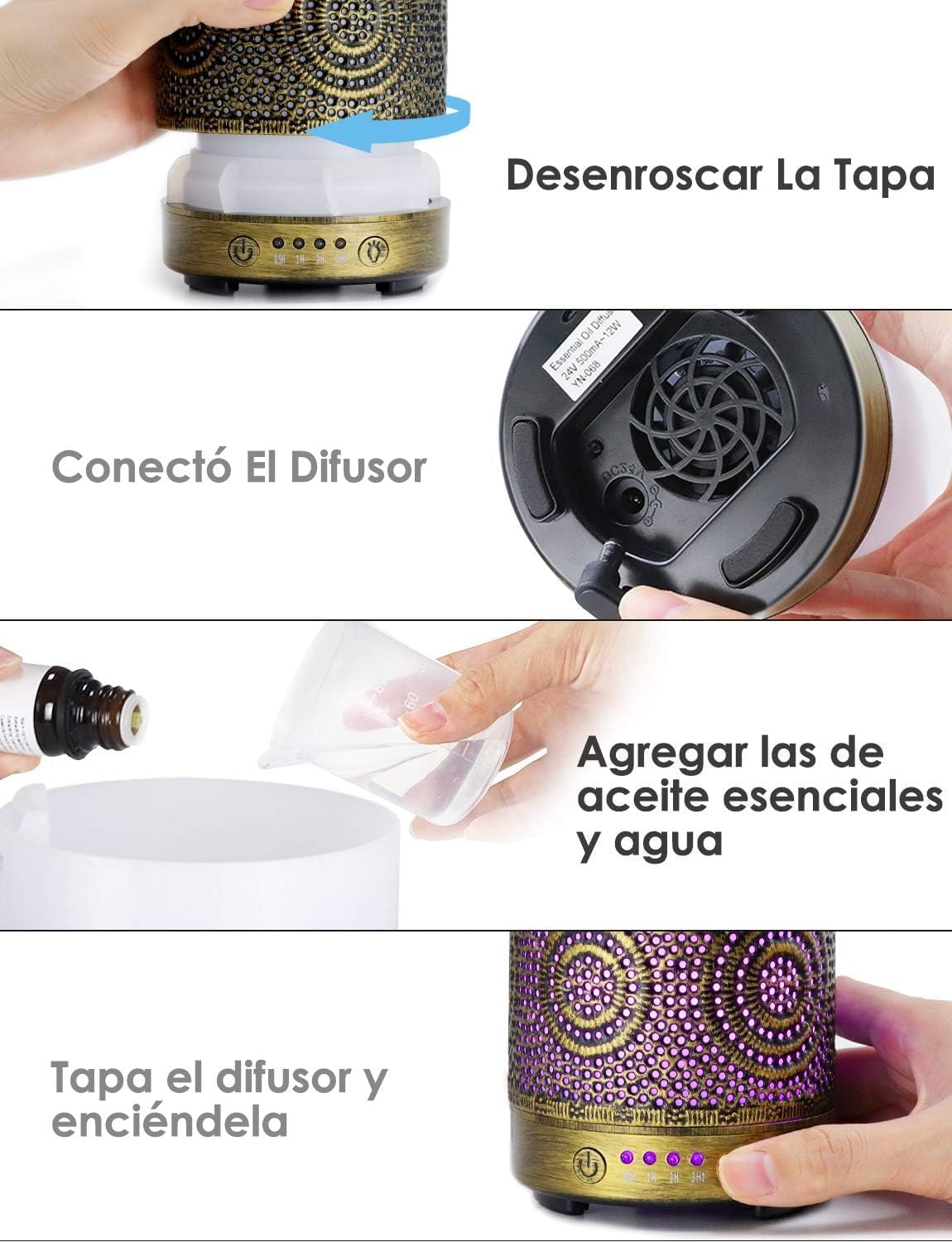 Decora cualquier espacio y aumenta la atmósfera con encantador difusor aceites esenciales. La luz colorida con efecto de luz de vela opcional y encantador diseño renacentista único pueden crear una sensación romántica para cualquier espacio. Se puede utilizar como humificadores aromaterapia / humidificadores bebes / Purificador de aire / Luz nocturna/Ambientador casa.