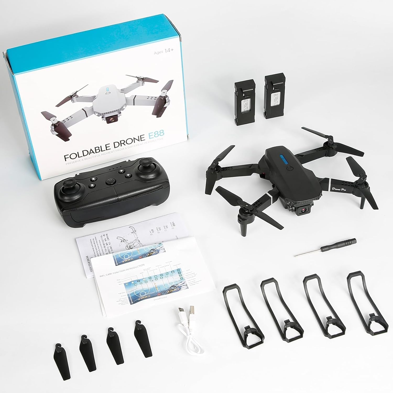 Función: arriba/abajo, adelante/atrás, girar a la izquierda/derecha, vuelo lateral, velocidad de vuelo de 3 niveles, luz LED, modo sin cabeza, retorno automático de una tecla, modo de retención de altitud, WiFi FPV, vuelo de trayectoria, cámara/video.