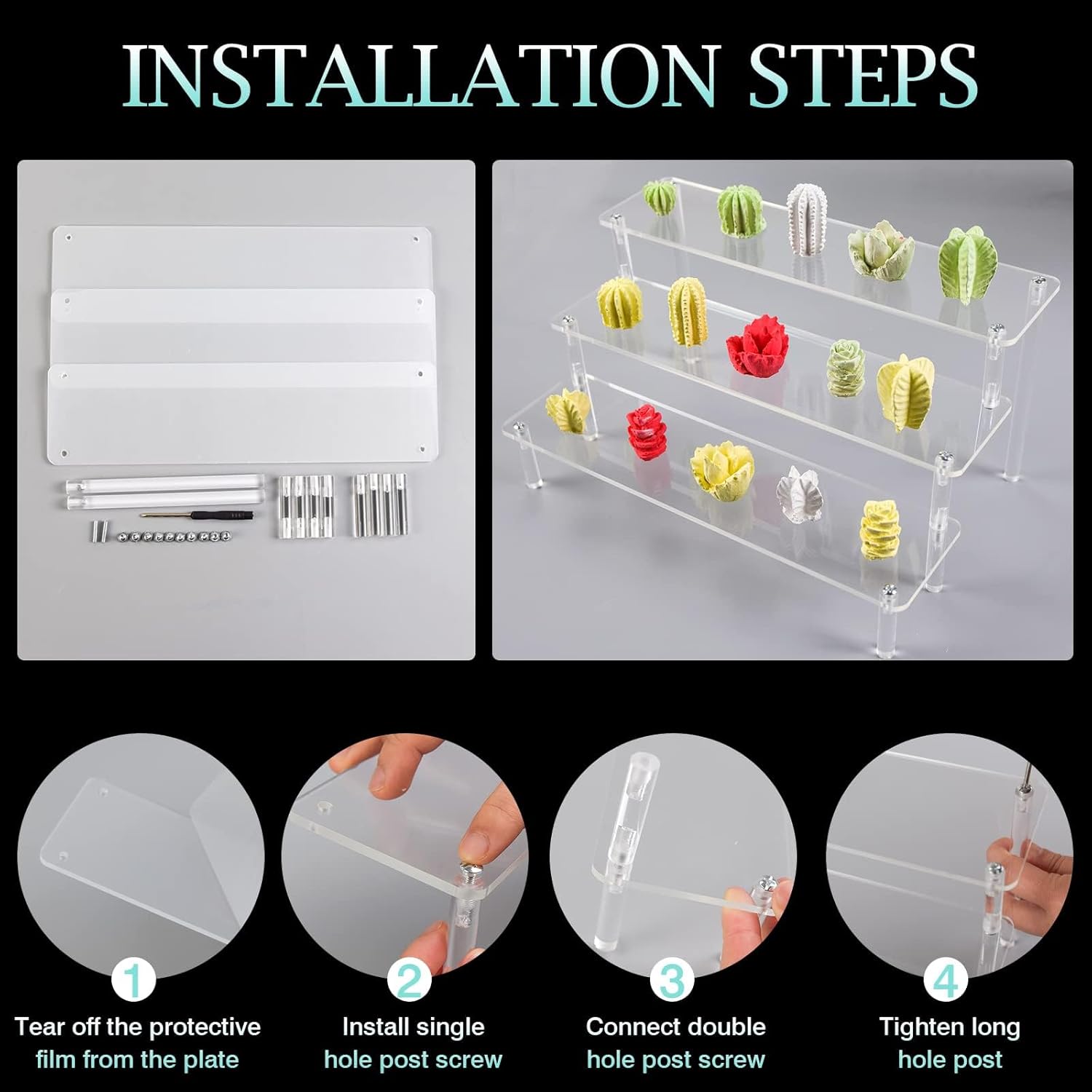 El expositor acrílico de 3 niveles Strehknewen es la solución perfecta para presentar con estilo sus figuras, joyas, productos cosméticos o delicias favoritas. Con su diseño transparente, garantiza que sus artículos estén en primer plano y al mismo tiempo crea orden. Ideal para utilizar en casa, en el negocio o en eventos como buffets o puestos de postres. Este práctico organizador también es ideal para esmaltes de uñas, especias o pequeños objetos de manualidades y será un elemento destacado en cualquier habitación.