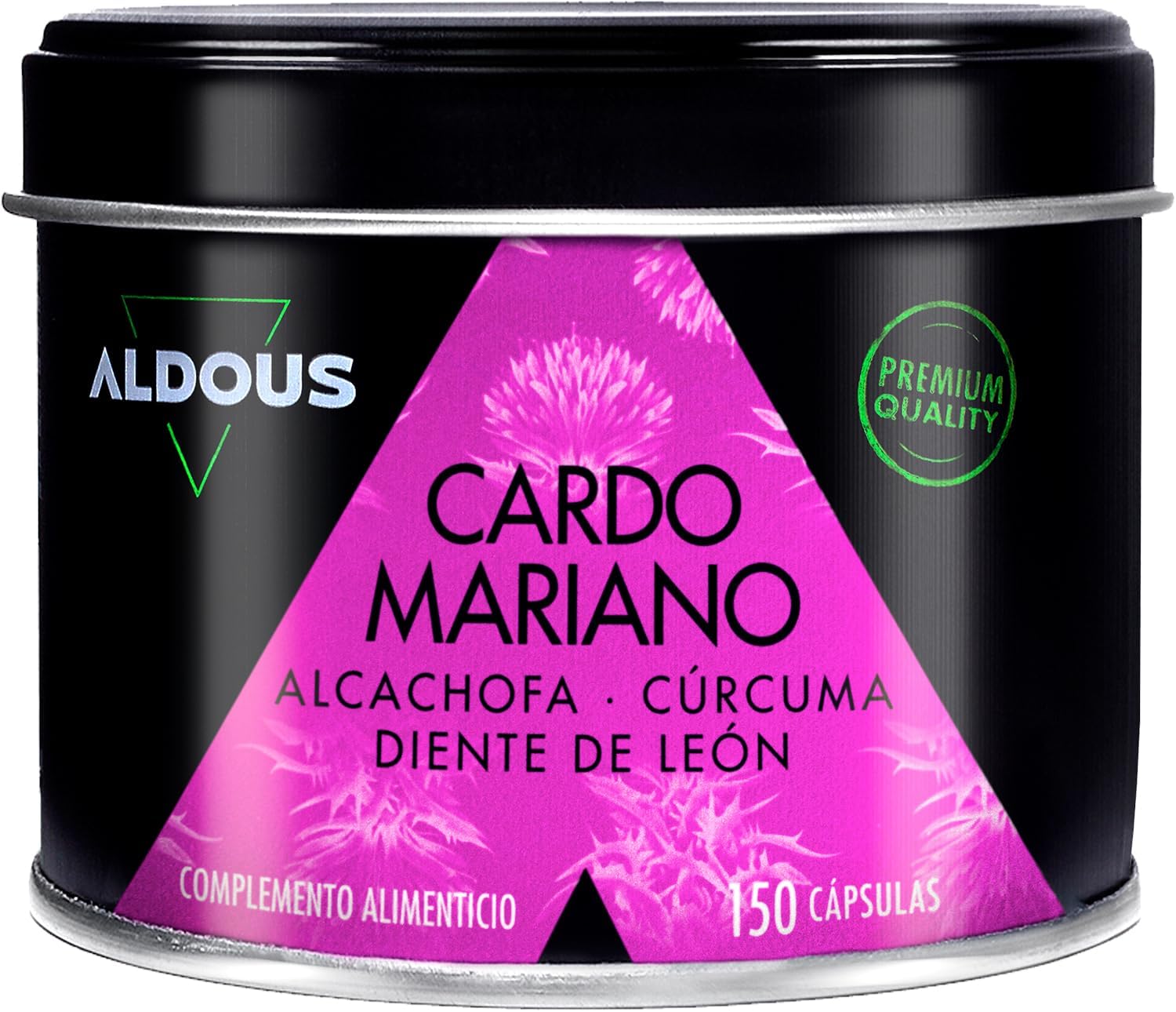 💊 150 CARDO MARIANO CAPSULAS TRIPLE ACCIÓN – El cardo mariano natural de Aldous son unas pastillas para higado que funcionan como detox depurativo. Nuestra formulación, compuesta por **Cardo Mariano con 80 % de Silimarina**, Extracto de Alcachofa, Cúrcuma, Diente de León y Desmodium, mejora la digestión, favorece la eliminación de gases, la retención liquidos, de toxinas y la desaparición del dolor estomacal.