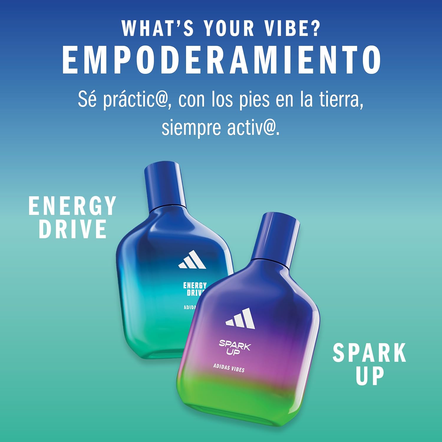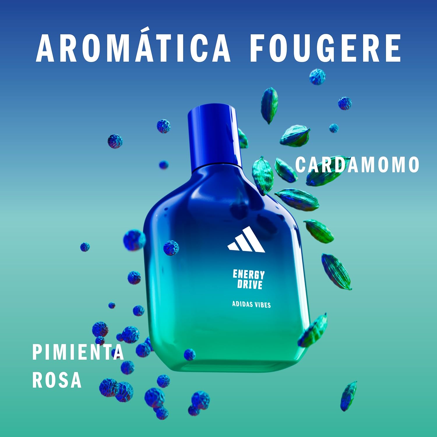 Siente las buenas vibraciones con las nuevas fragancias adidas. Está demostrado que el perfume Vibes Energy Drive transmite energía positiva. Con notas empoderadas y luminosas de **cardamomo** y **pimienta rosa**, para ofrecerte un imparable estallido de energía, como si nada pudiera interponerse en tu camino.