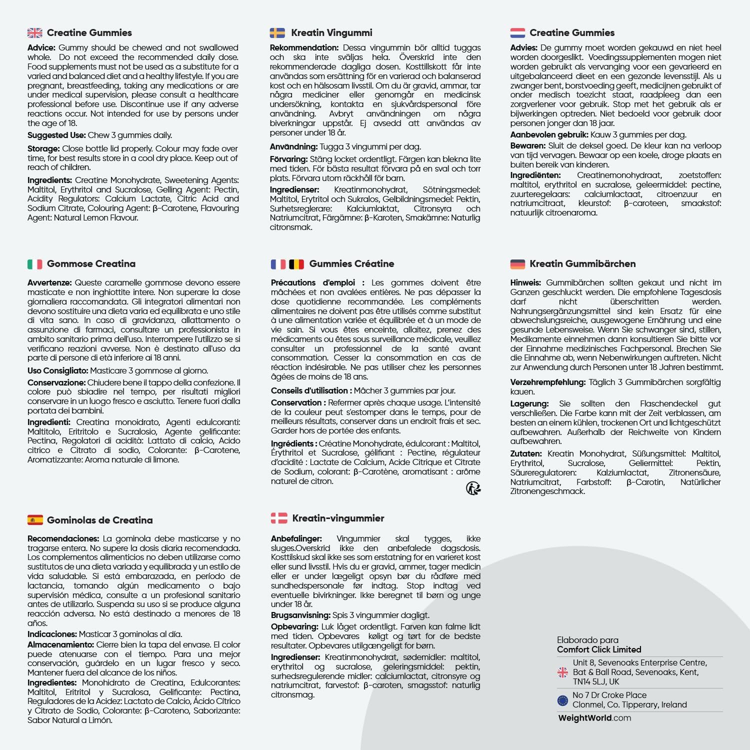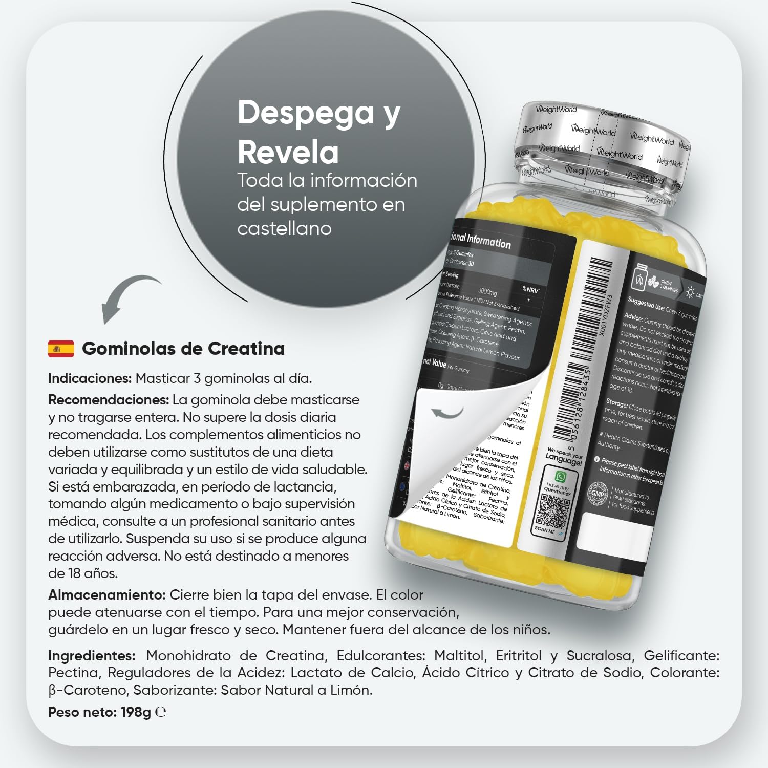 ¿Por Qué Elegir el Monohidrato de Creatina en Gominolas de WeightWorld? – Llegó la hora afrontar los entrenos de una manera muy distinta. Deja a un lado las medidas y mezclas de la creatina en polvo y da el salto hacia la comodidad y el sabor con estas gomitas de creatina de limón, hechas por y para romper límites, con una concentración de 3000mg por porción.