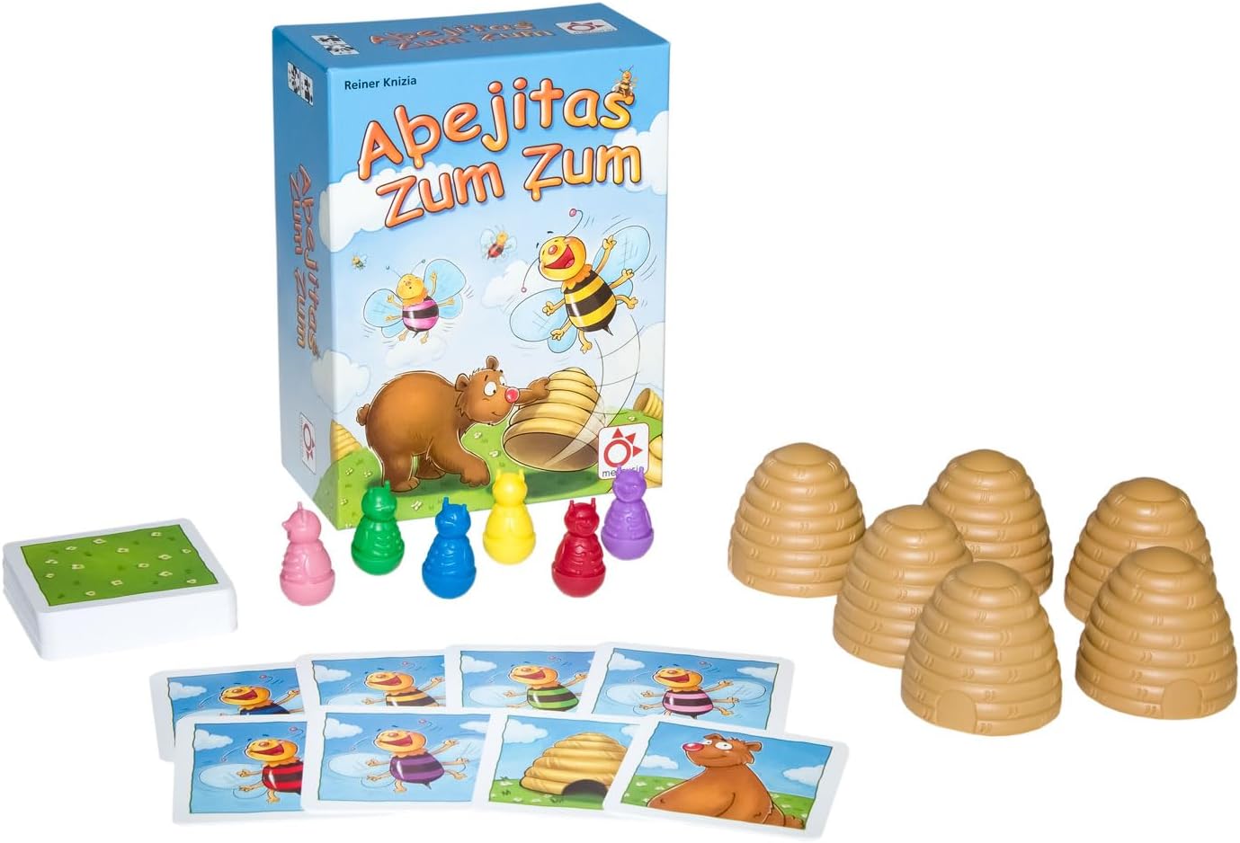 Bzzz, bzzz… pero, ¿¡Dónde se han escondido las coloridas abejitas!? ¿Podrás encontrar a estas pequeñas zumbadoras en sus colmenas? No estés tan seguro, porque no paran de cambiar de sitio. Roba una carta e intenta encontrar la abeja correcta para poder llevarte la miel. El jugador que consiga coger cuatro colmenas gana la partida. Abejitas ZumZum, ¡un inteligente juego para pequeños apicultores con memoria!
