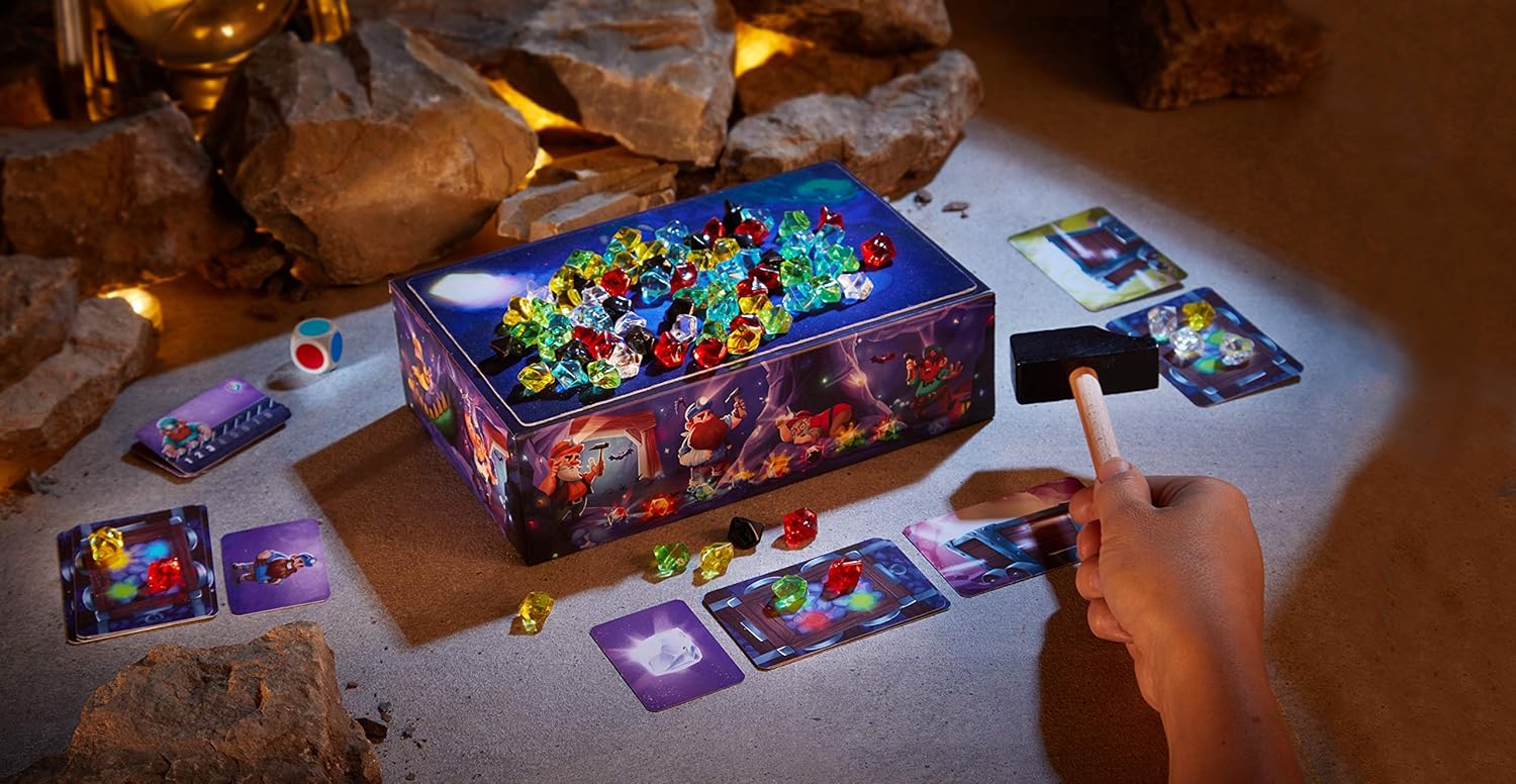 Los jugadores conseguirán valiosos tesoros golpeando la caja con el martillo. Para completar sus tareas, deberán recoger el número y el color de piedras preciosas correspondientes. Pero, ¡cuidado!, porque quien golpee con demasiada fuerza despertará al dragón Dragomir y perderá su botín. Gana quien consiga cargar primero sus 4 vagonetas. Contenido: 16 cartas grandes con vagoneta (en 4 colores), 9 cartas de tarea, 1 carta de «jugador inicial», 1 martillo, 90 piedras preciosas (10 transparentes y 16 azules, verdes, amarillas, rojas y negras), 1 estera adhesiva, 1 caja, 1 dado de color (para la variante profesional), 1 instrucciones del juego.