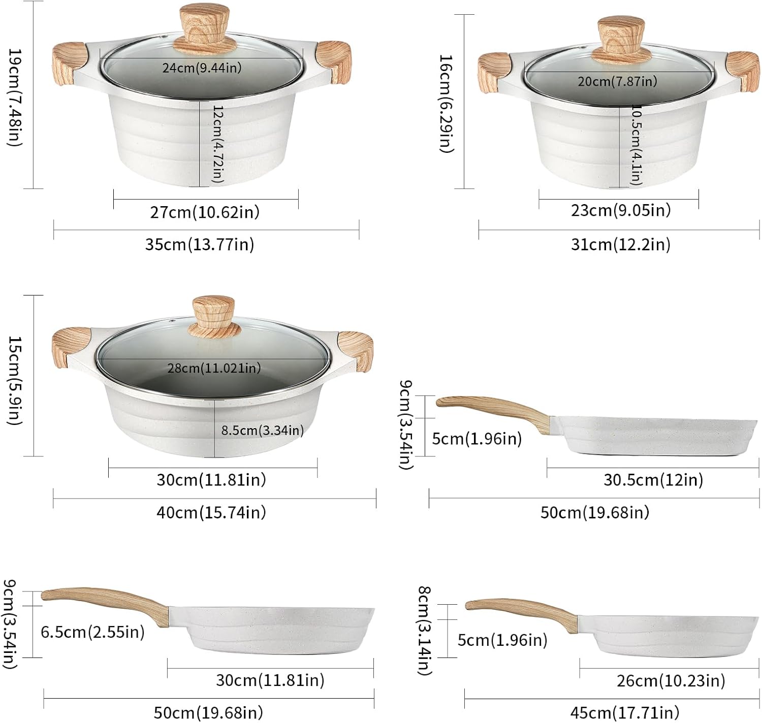 Súper antiadherente y resistente a los arañazos – Nuestro Juego de ollas y sartenes utiliza una estructura de aluminio fundido duradera, con materiales de granito antiadherente superiores y más duros, y la estructura de aluminio fundido garantiza una durabilidad y una distribución uniforme del calor. Esto permite cocinar fácilmente tu receta favorita sin preocuparte por que la comida se pegue a la superficie.