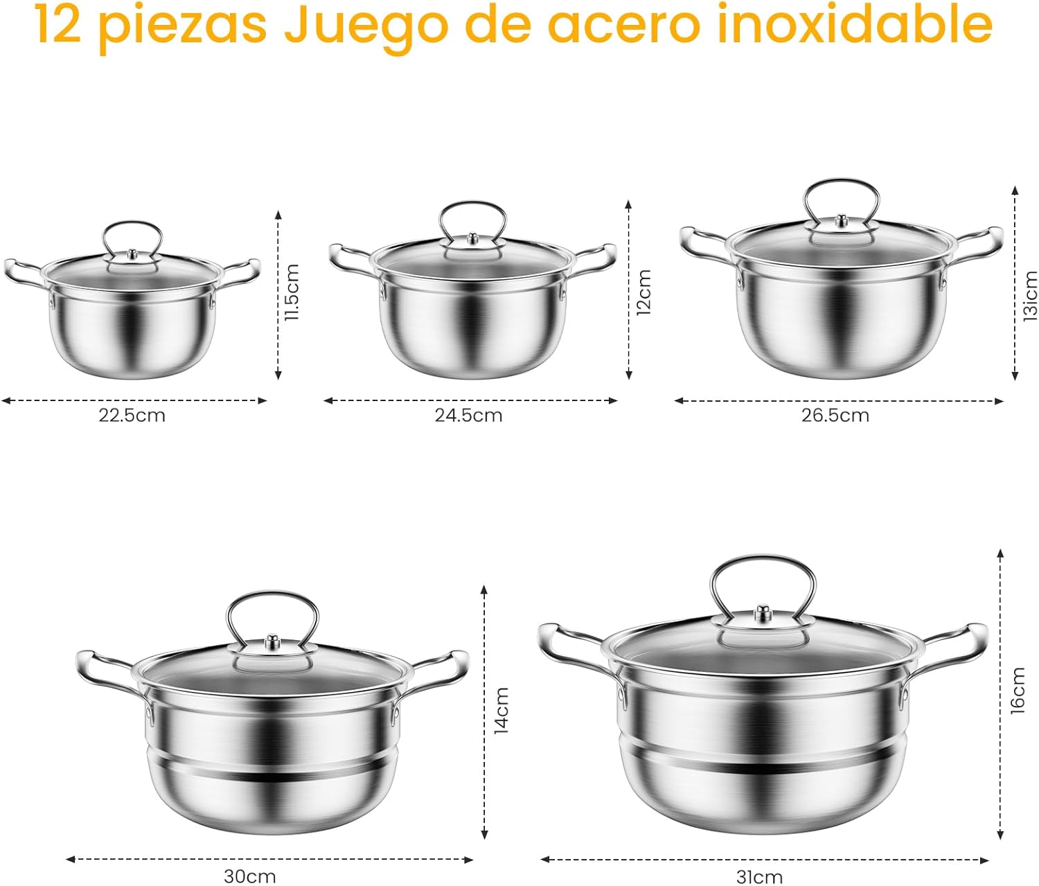 Juego de utensilios de cocina de acero inoxidable, 12 piezas de utensilios de cocina de inducción, compatible con cocinas de inducción, eléctricas y de gas, con tapa de vidrio (Plata clara) – ¿vale la pena?