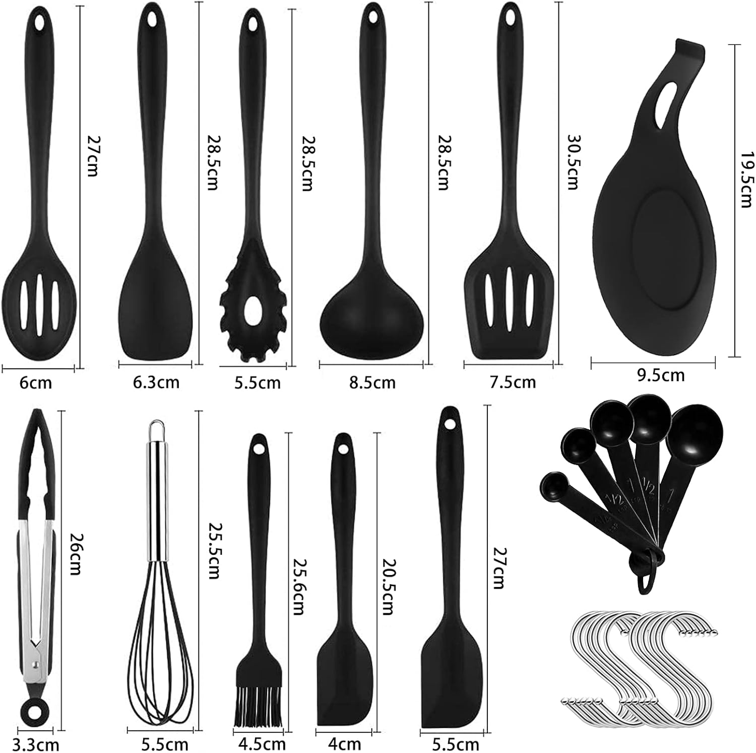Este juego de utensilios de cocina de silicona contiene 14 piezas diferentes, incluyendo batidor de huevos, cepillo, raspador grande, raspador pequeño, cuchara, pinzas de cocina, cuchara de drenaje, trampa de polvo, espátula de mantequilla, cuchara de drenaje, almohadilla de cuchara negra, 12 ganchos en S, 5 cucharas medidoras y caja de almacenamiento. Estos utensilios te brindan todas las herramientas necesarias para complementar tus platos y hacer que cocinar sea mucho más fácil.