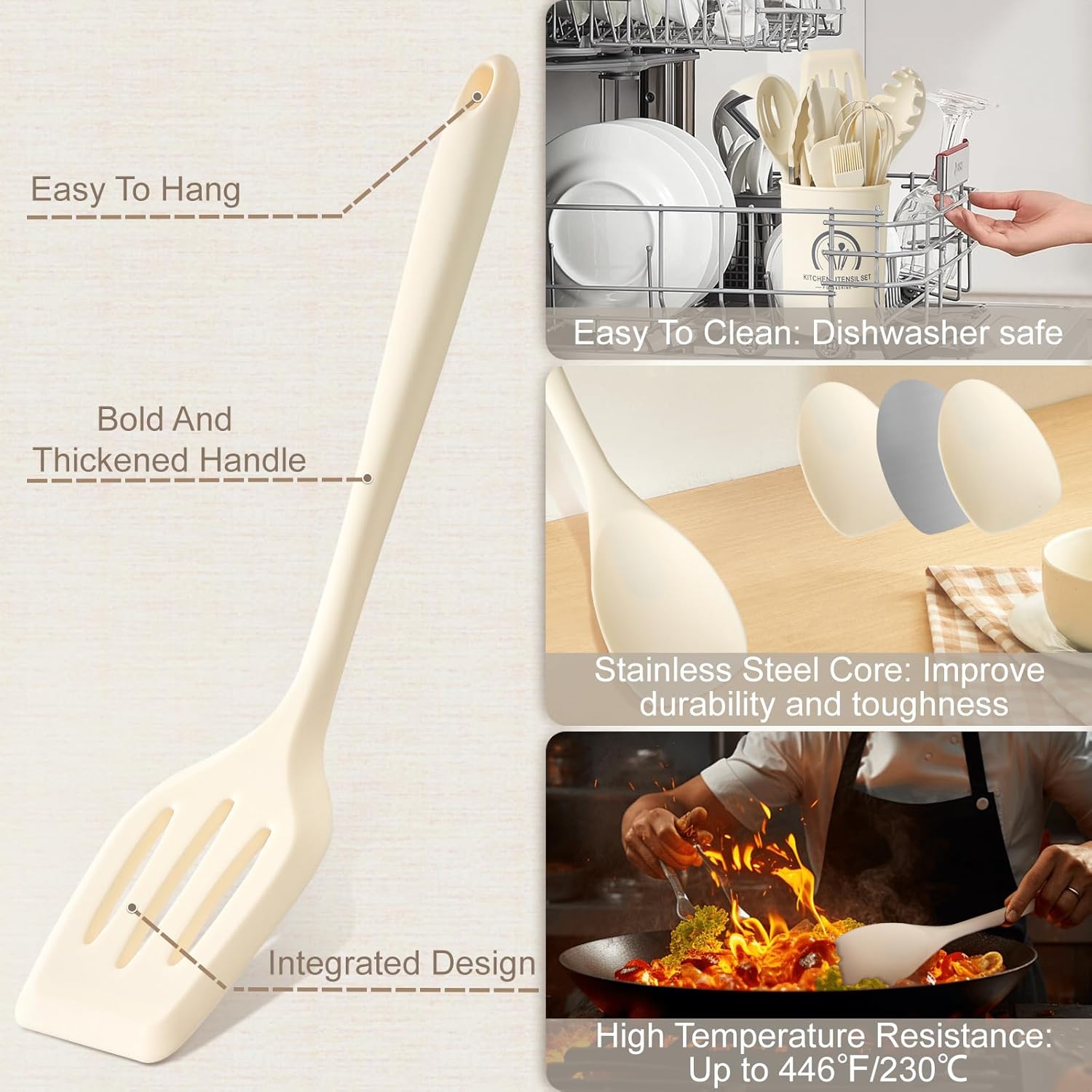 | Resistente al calor hasta 446 °F/230 °C | Algunos usuarios pueden preferir utensilios de cocina de materiales tradicionales |