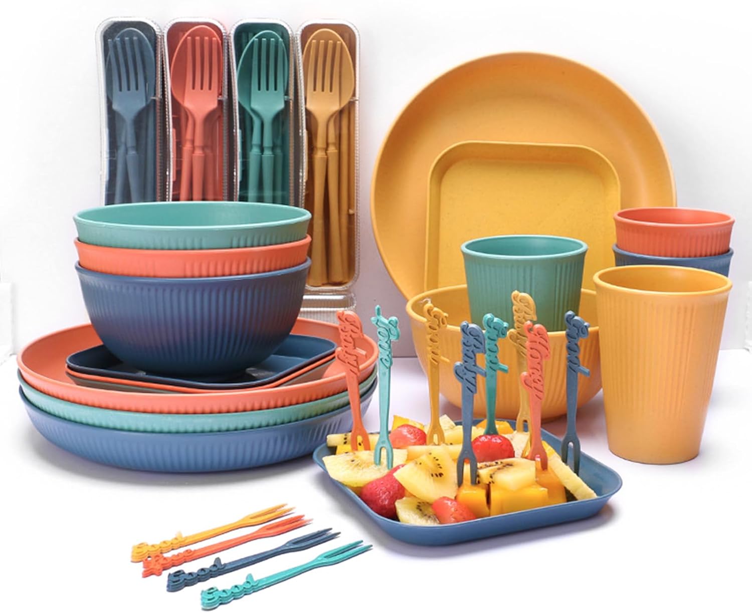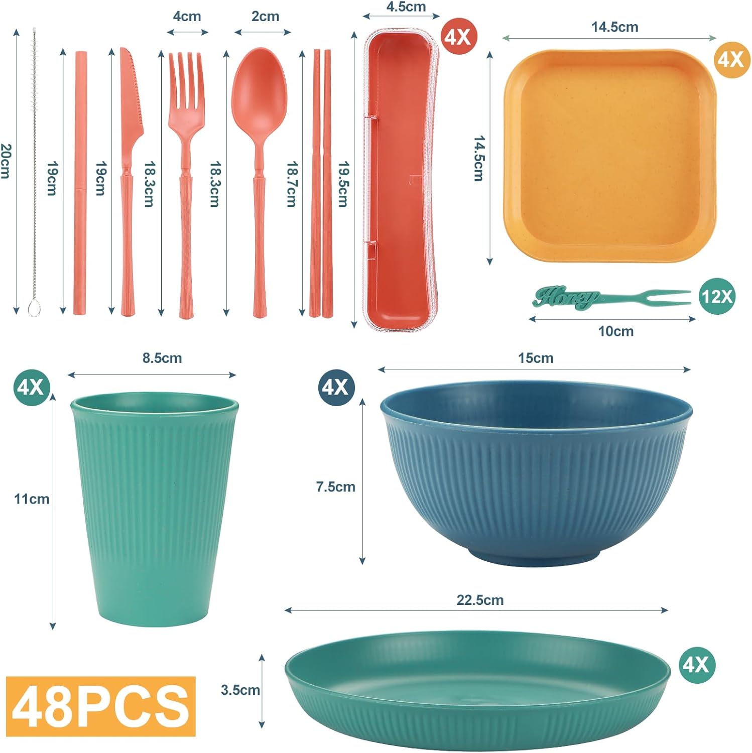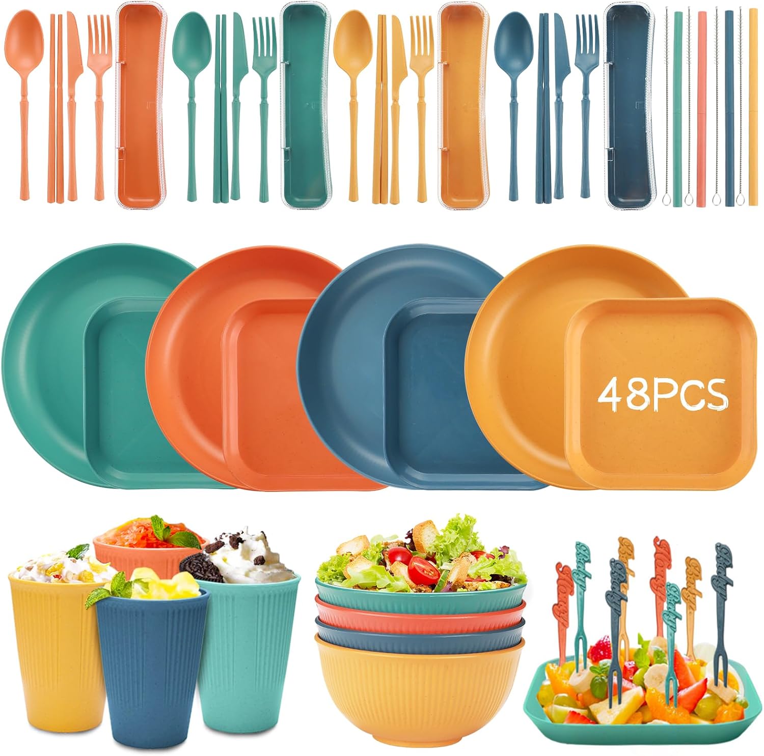 🍴**Juego de vajilla de plástico:** Juegos de Vajilla de 48 piezas, apto para 4 personas,Tazón de 15 cm x 4, plato de ensalada de 22,5 cm x 4, plato de postre de 14,5 cm x 4, taza de 350 ml x 4, juego de cuchillo, tenedor, cuchara y palillos de colores x 4, tenedor de fruta de 10 cm x 12, pajita x 4, cepillo para tazas x 4.