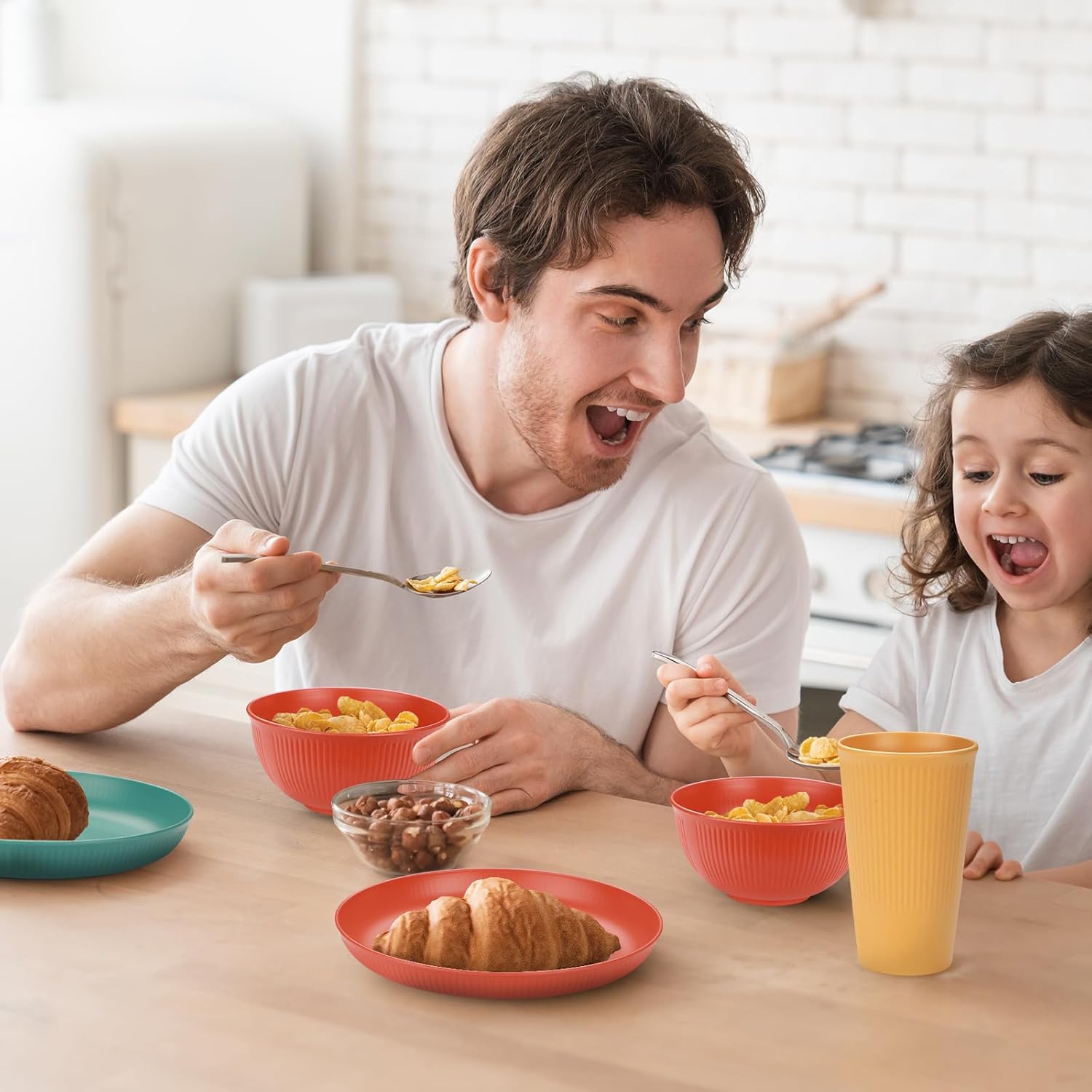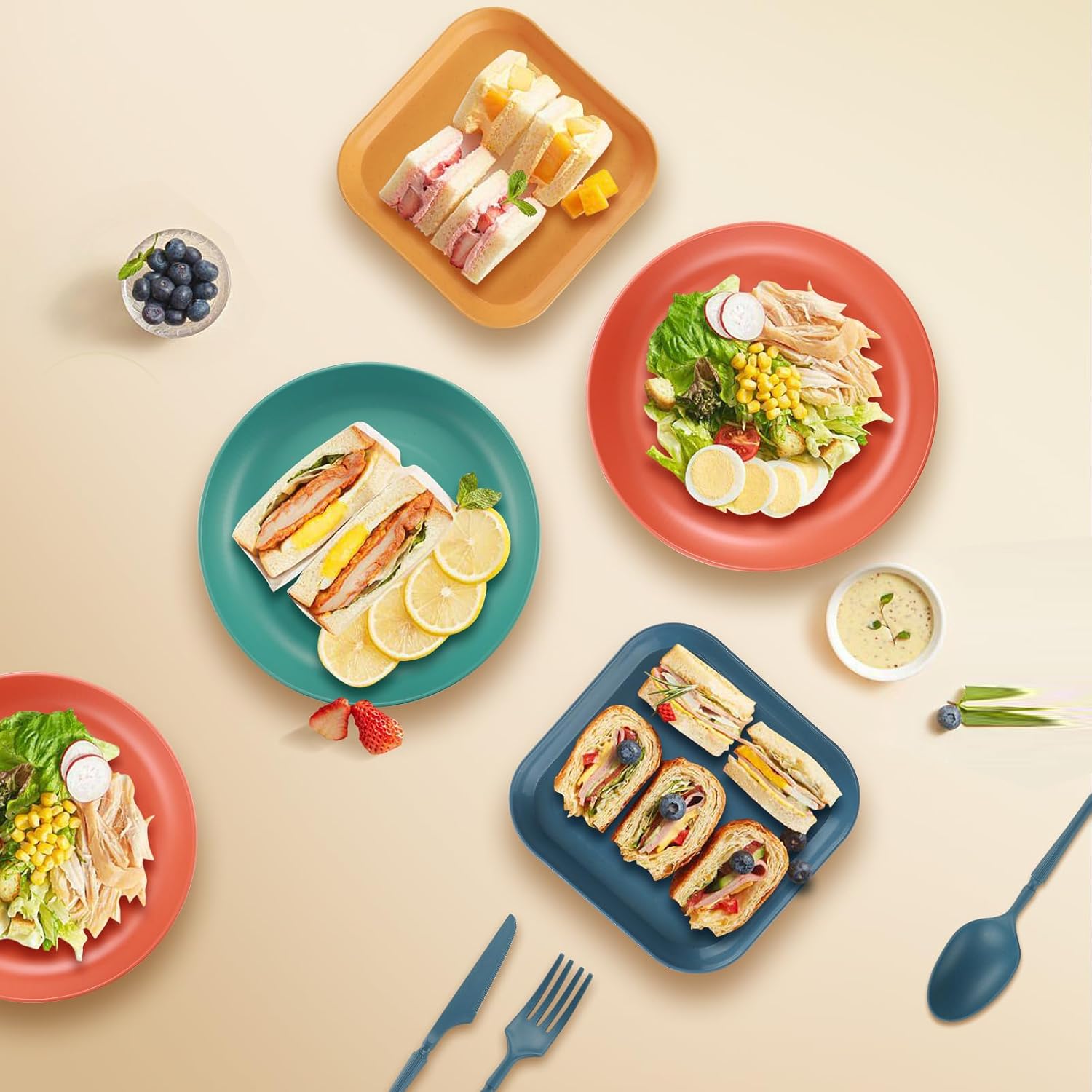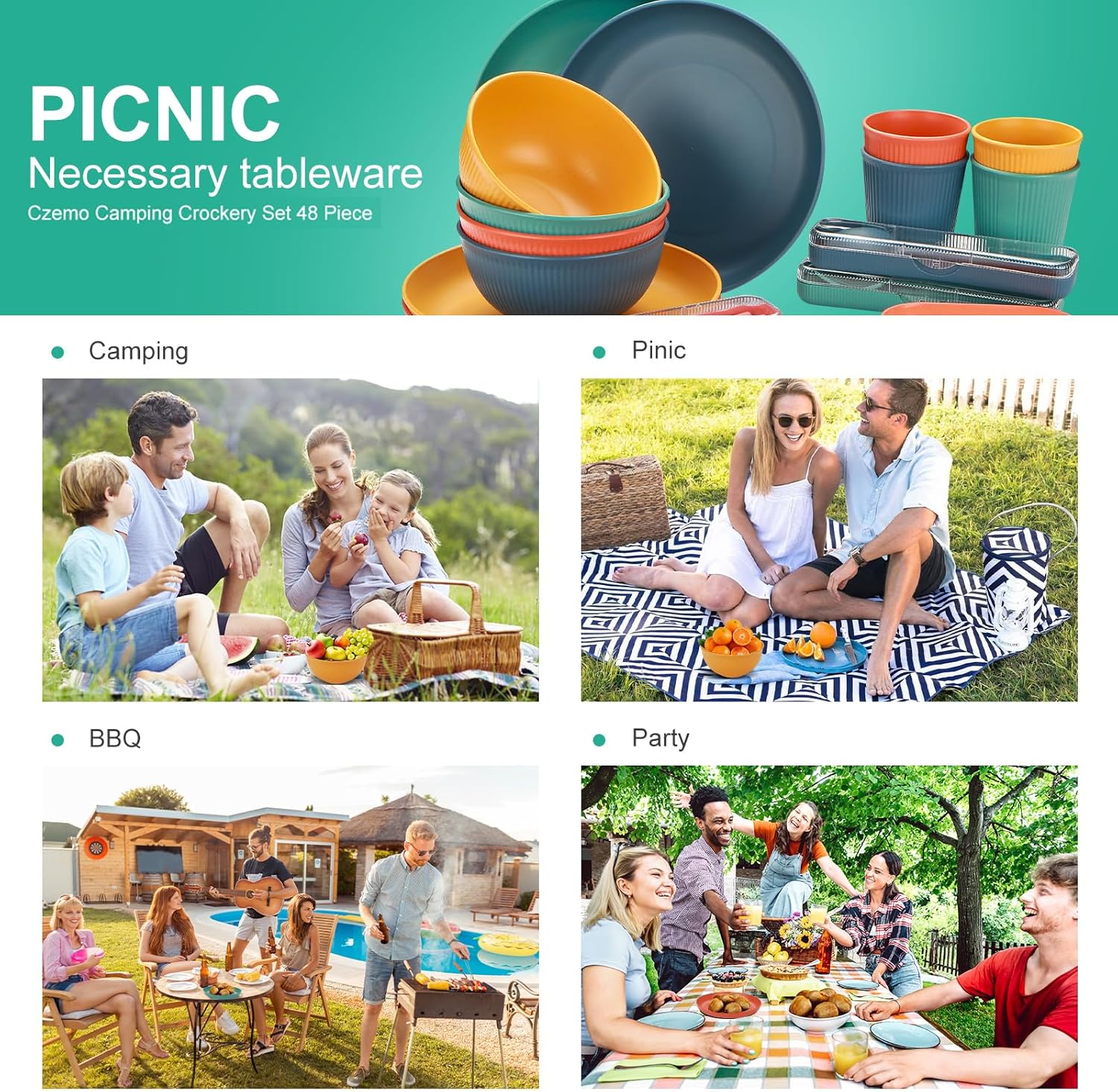 🍴**Juego de vajilla de plástico:** Juegos de Vajilla de 48 piezas, apto para 4 personas,Tazón de 15 cm x 4, plato de ensalada de 22,5 cm x 4, plato de postre de 14,5 cm x 4, taza de 350 ml x 4, juego de cuchillo, tenedor, cuchara y palillos de colores x 4, tenedor de fruta de 10 cm x 12, pajita x 4, cepillo para tazas x 4.