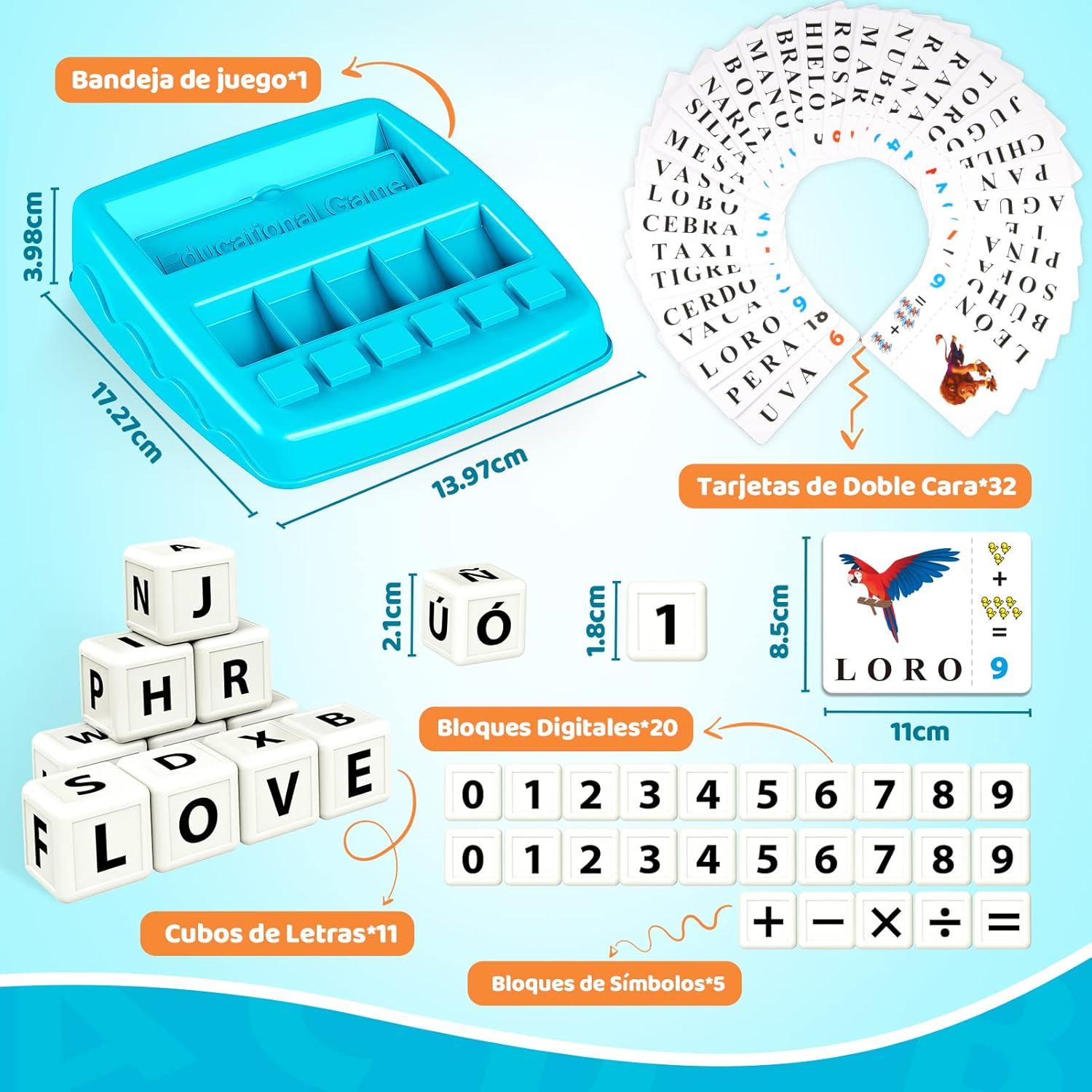 El Jinxful Juego Educativo es un juguete 2 en 1 que incluye una bandeja de juego, tarjetas con palabras, cubos de letras, cubos numéricos y bloques con símbolos matemáticos. Este juego educativo es ideal para niños de 3 a 8 años y les permite aprender ortografía, aritmética y colaborar con padres y amigos. Está fabricado con materiales ecológicos profesionales no tóxicos y es perfecto para desarrollar habilidades como el pensamiento lógico, la alfabetización y la memoria.