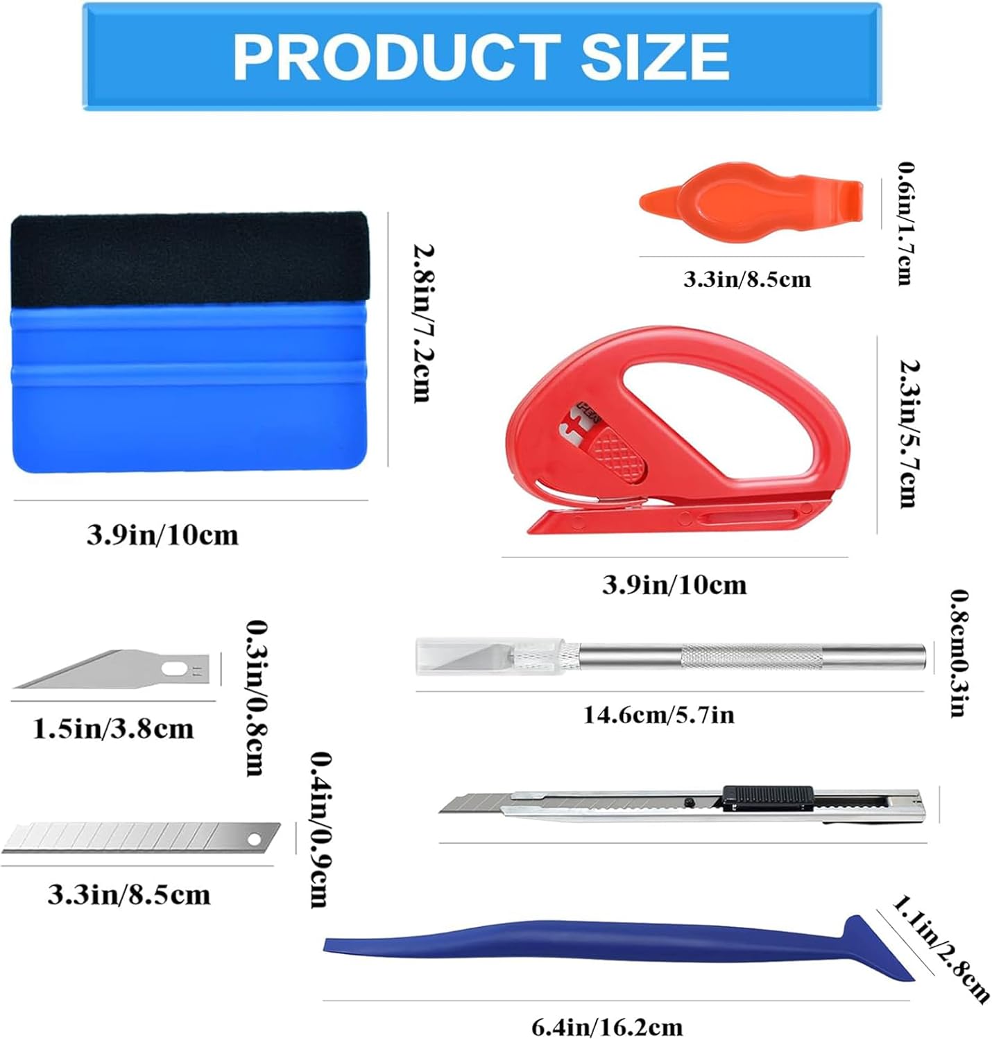 Este juego completo de raspadores de lámina incluye todas las herramientas necesarias para simplificar el proceso de instalación de lámina y aumentar la eficiencia. Ya sea que esté buscando herramientas para aplicar película a su automóvil, ventanas o muebles, este juego es la mejor opción.