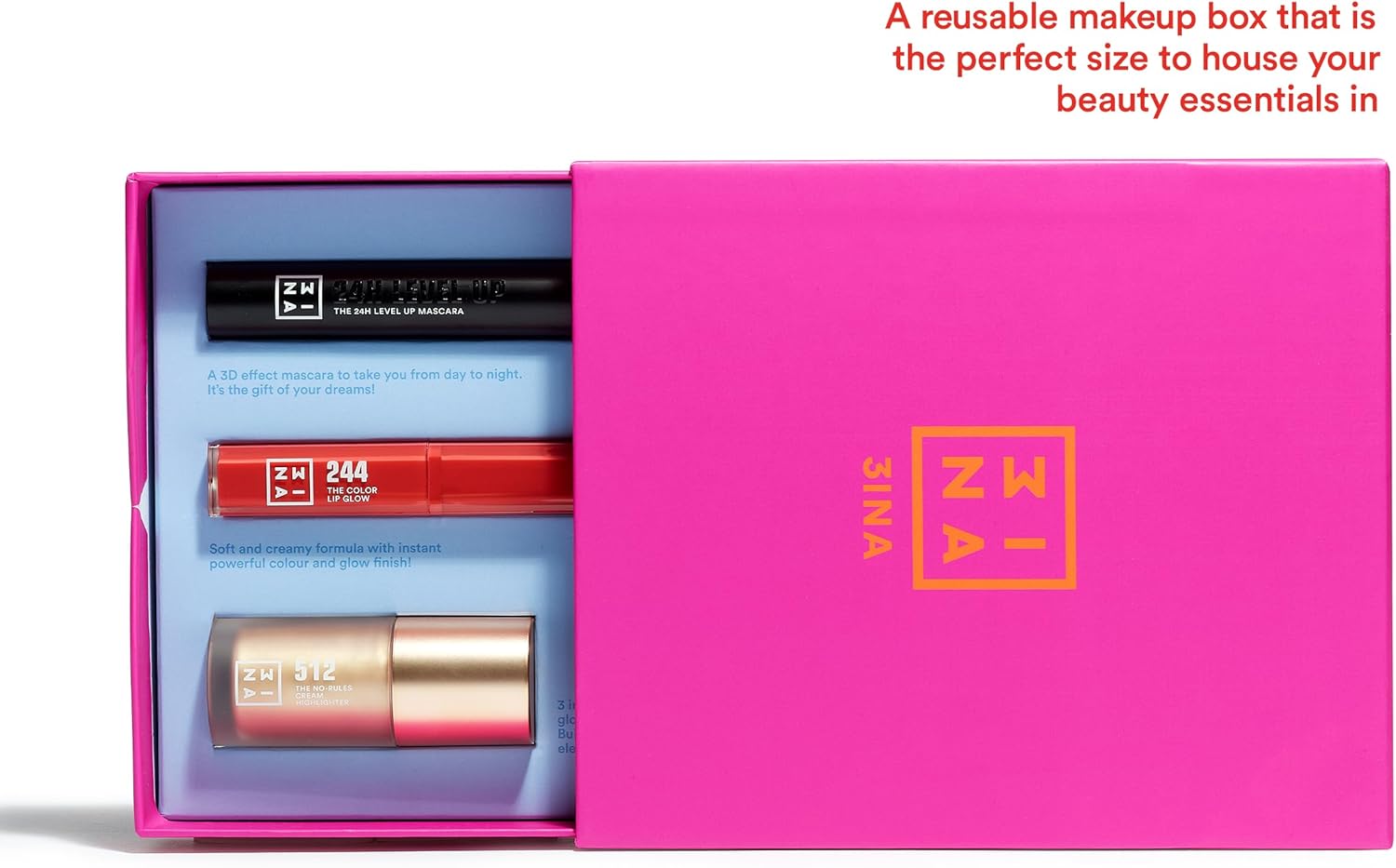 3 PRODUCTOS ICÓNICOS DE 3INA EN UN KIT: Tres productos icónicos de nuestra marca en tamaño estándar: The 24H Level Up Mascara, The No-Rules Cream Highlighter y The Color Lip Glow 244.