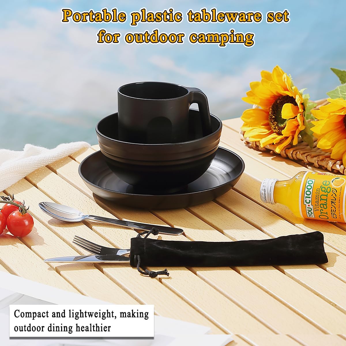 ALTA CALIDAD: Los platos y tazas de este conjunto de camping están hechos de material pp. Son livianos, irrompibles y resistentes, los cubiertos de acero inoxidable están hechos de acero inoxidable de alta calidad, resistentes y duraderos.