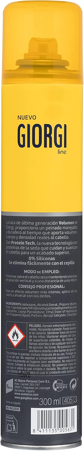Prueba la Laca Volumen de Giorgi, la nueva generación de lacas que proporciona un peinado manejable y duradero al tiempo que aporta volumen, cuerpo y densidad reales al cabello. Su tecnología Proteín Tech, la nueva tecnología con proteínas de la seda que cuidan y suavizan el cabello para un acabado superior. 0% Siliconas. Se elimina fácilmente con el cepillo. No acartona. Sin residuos. ¿Cómo se aplica? – Agitar bien antes de usar. – Pulverizar sobre el cabello seco manteniendo el envase en posición vertical y a una distancia de unos 40cm.
