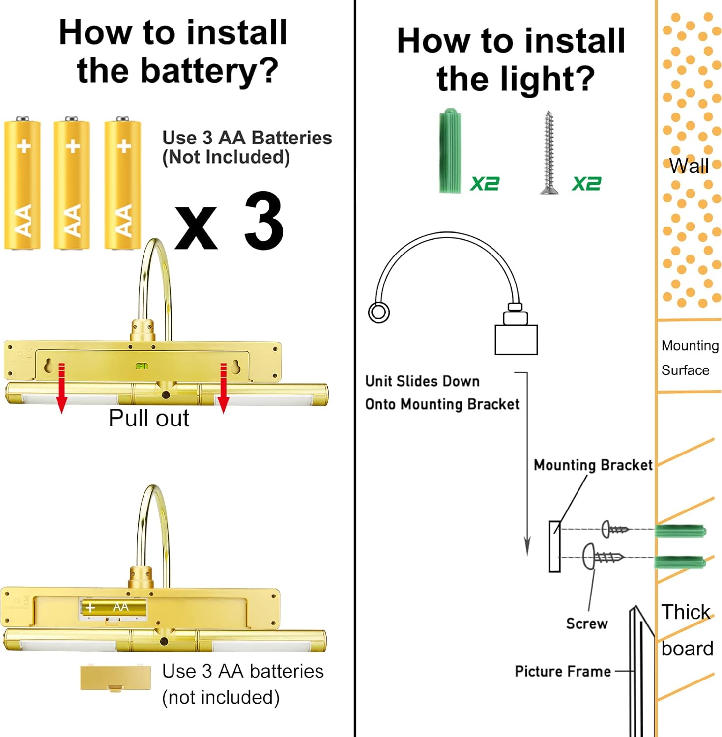 3 modos de iluminación y funciona con pilas: funciona con 3 pilas AA (no incluidas). Cada luz de espejo tiene 12 luces LED superbrillantes, 100 lúmenes, 3 modos de iluminación para tu elección (3000 K blanco cálido, 4300 K blanco natural, 8000 K blanco frío).